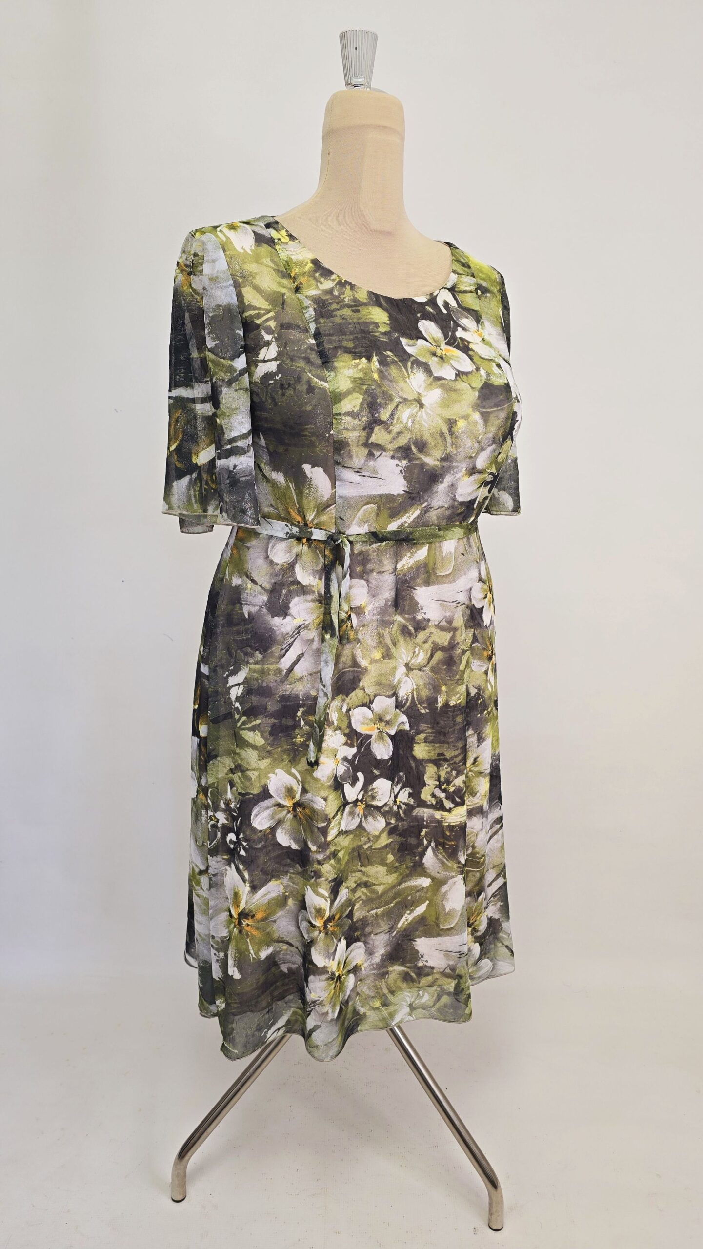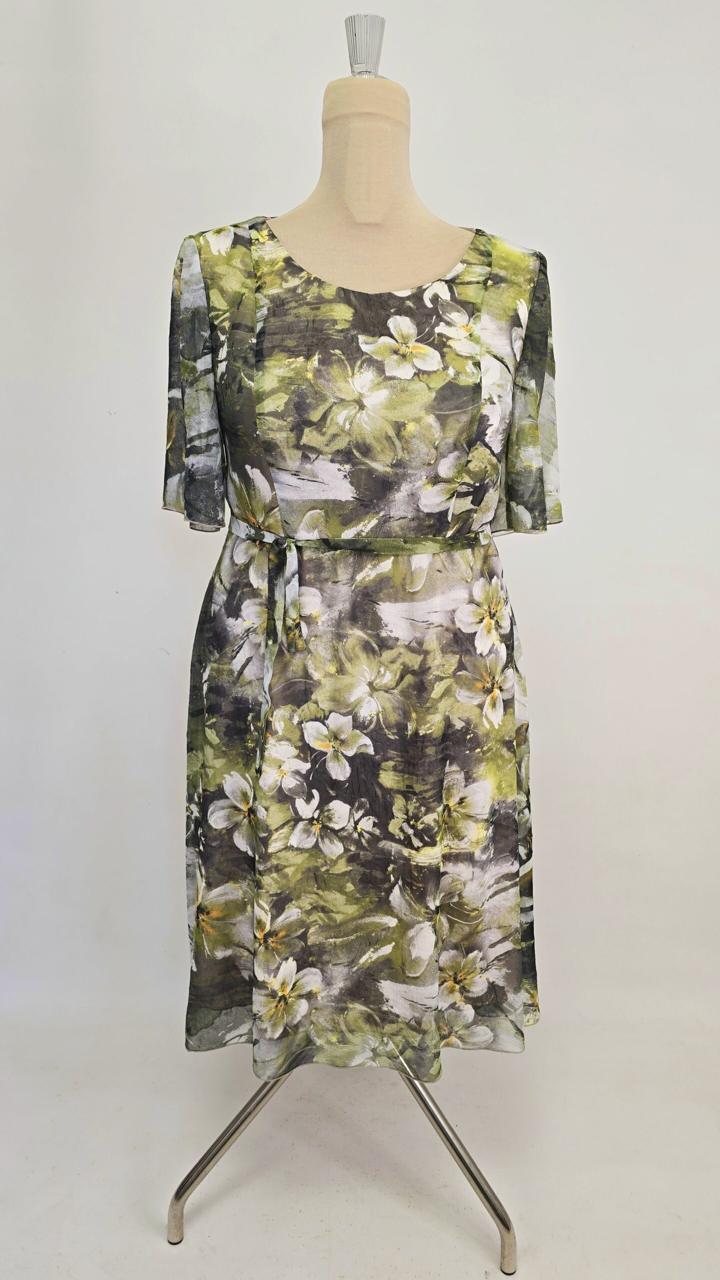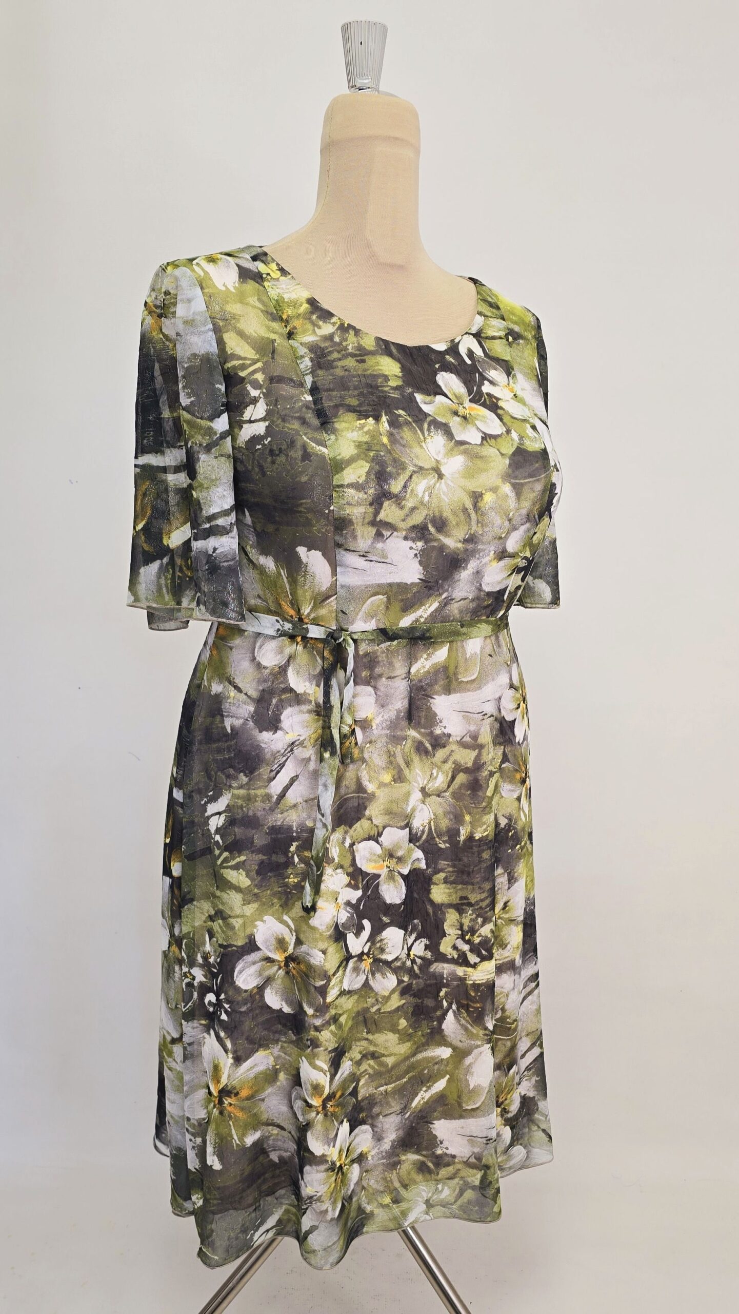 Rochie eleganta voal texturat cu sidef captusita, cu maneca ampla la cot si cordon