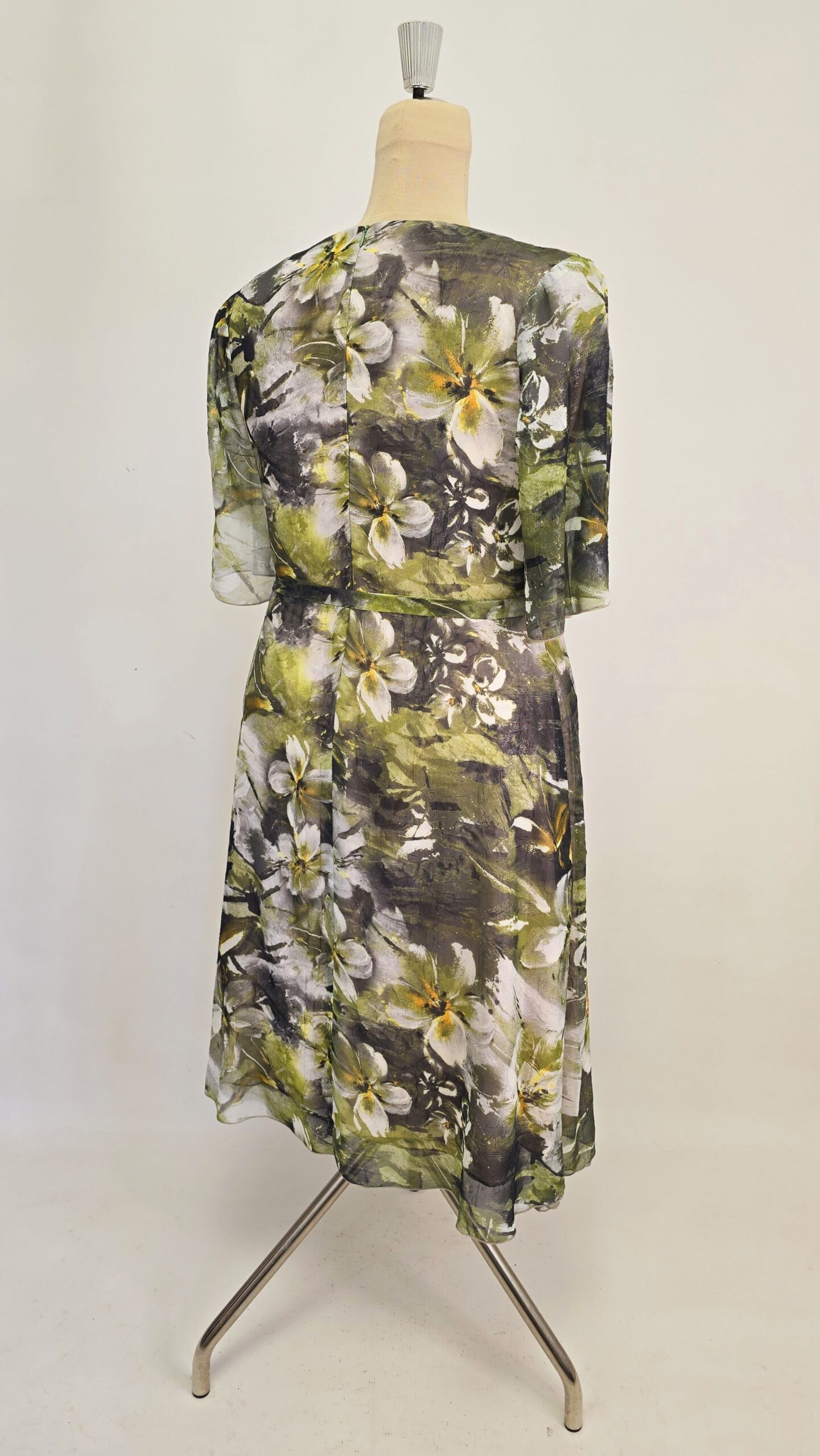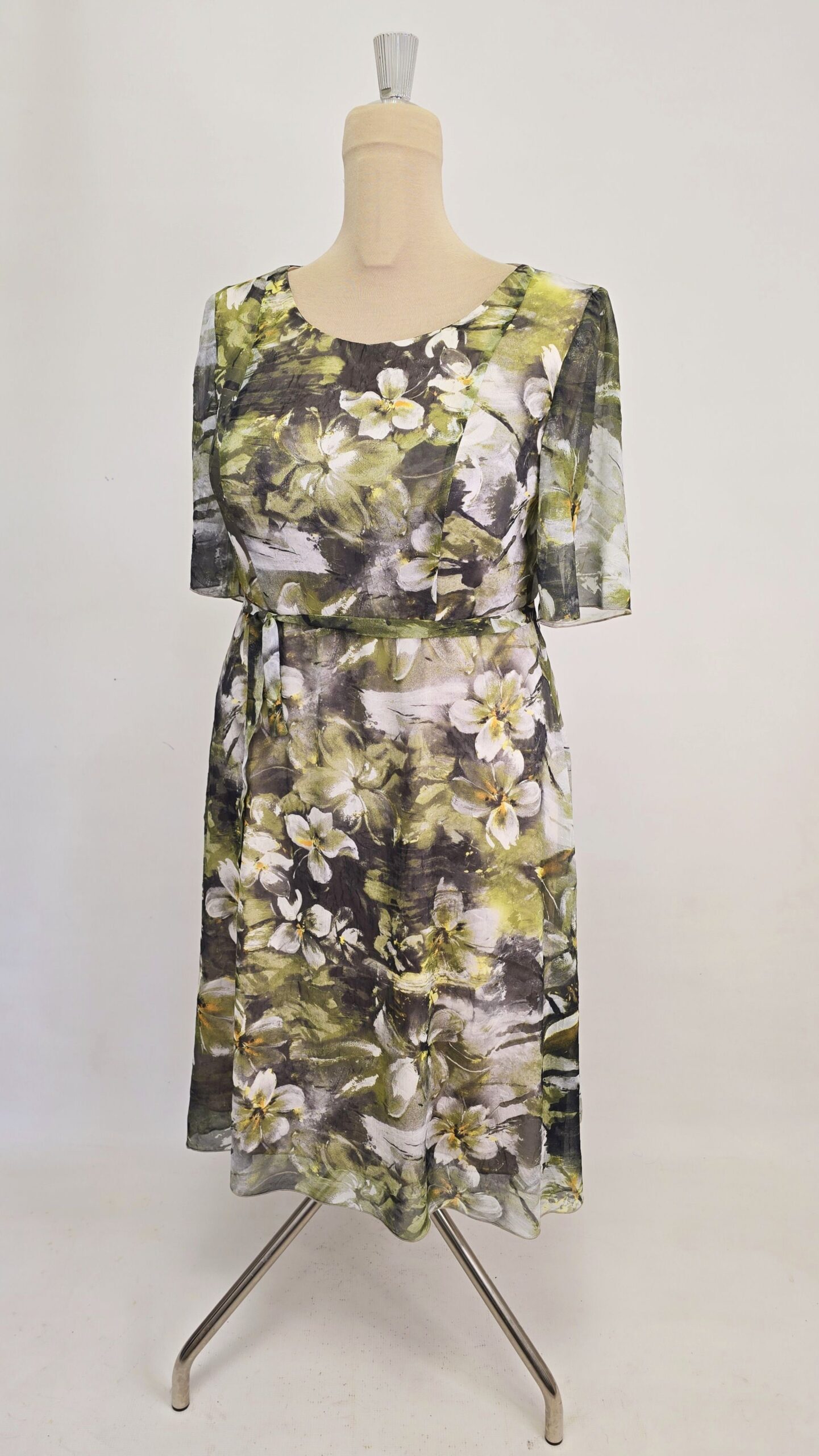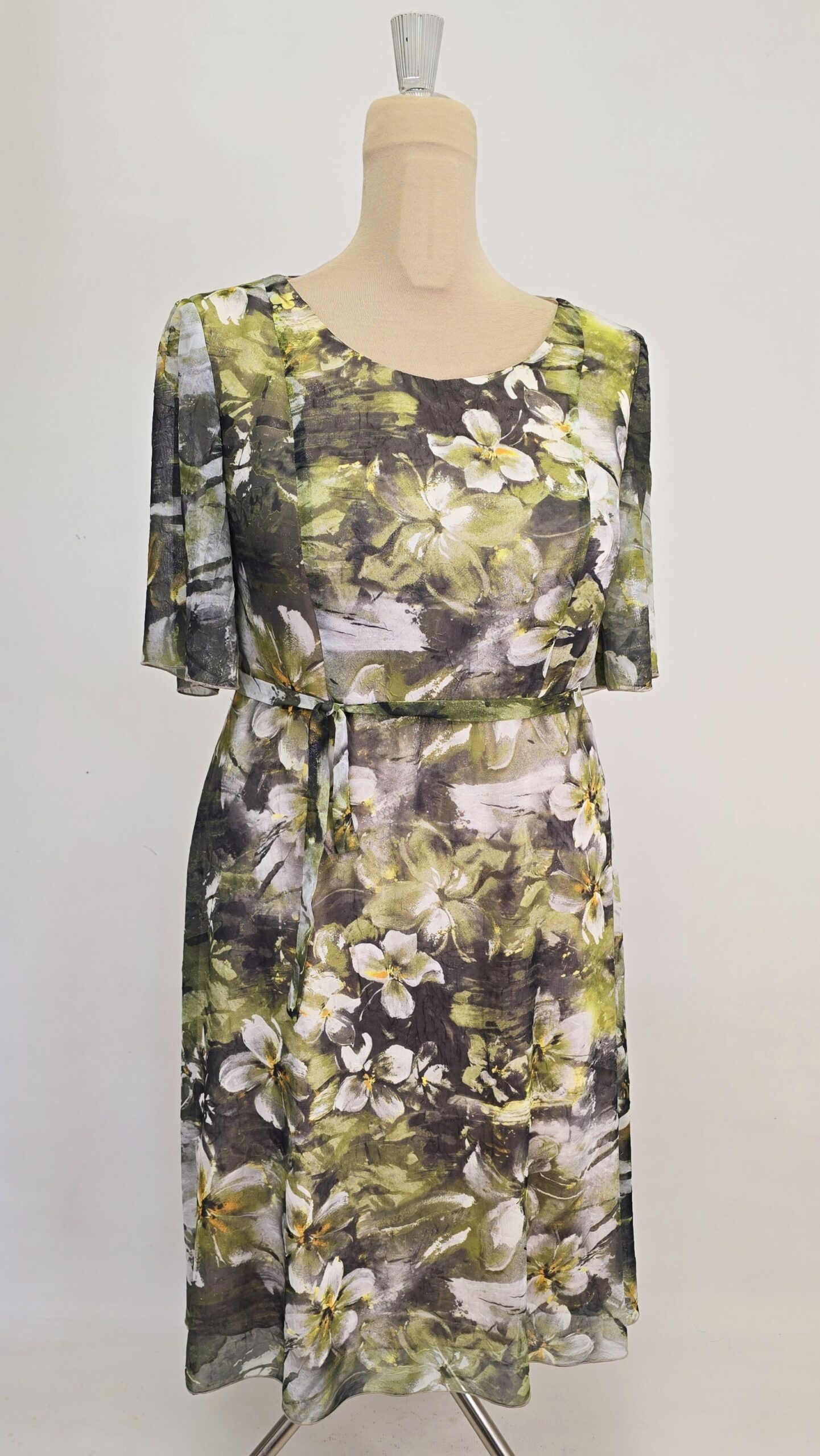 Rochie eleganta voal texturat cu sidef captusita, cu maneca ampla la cot si cordon
