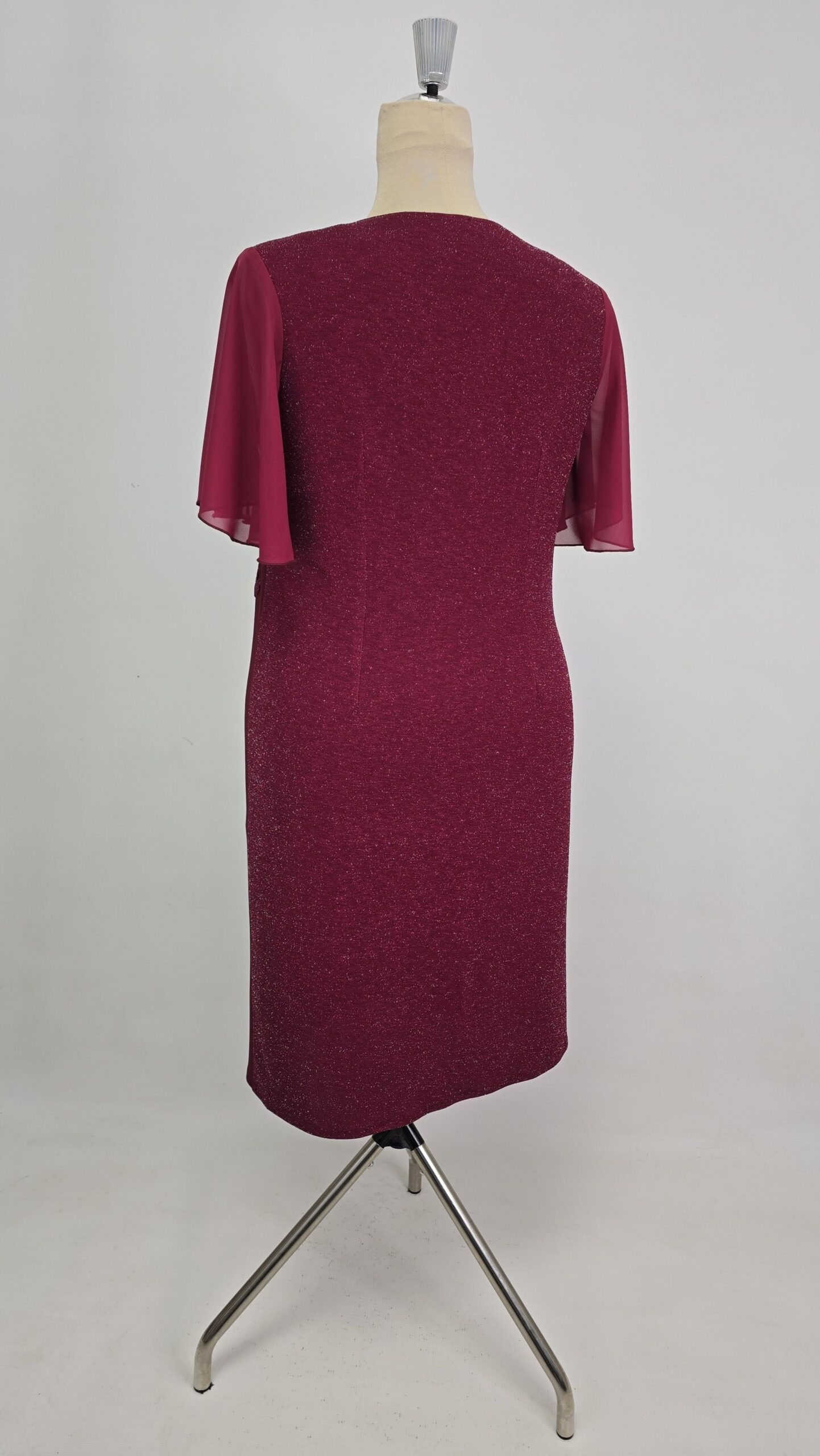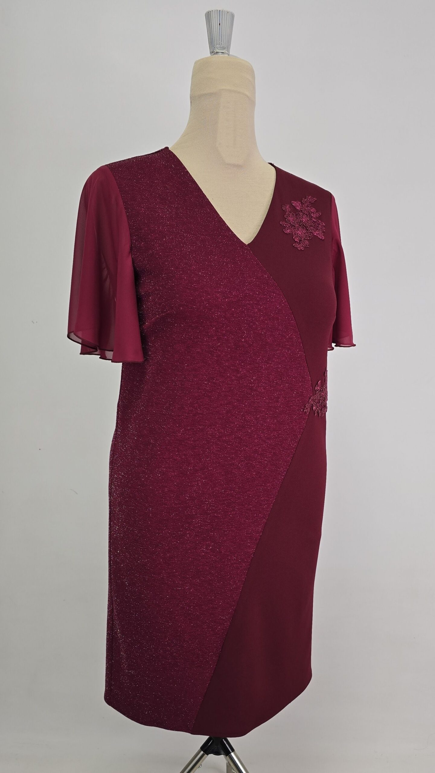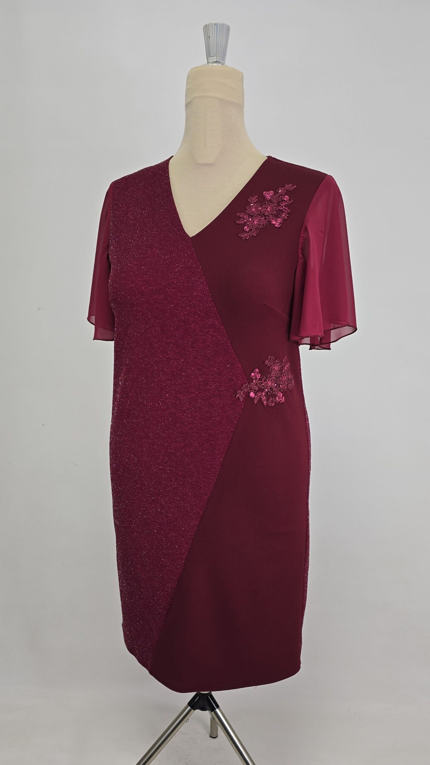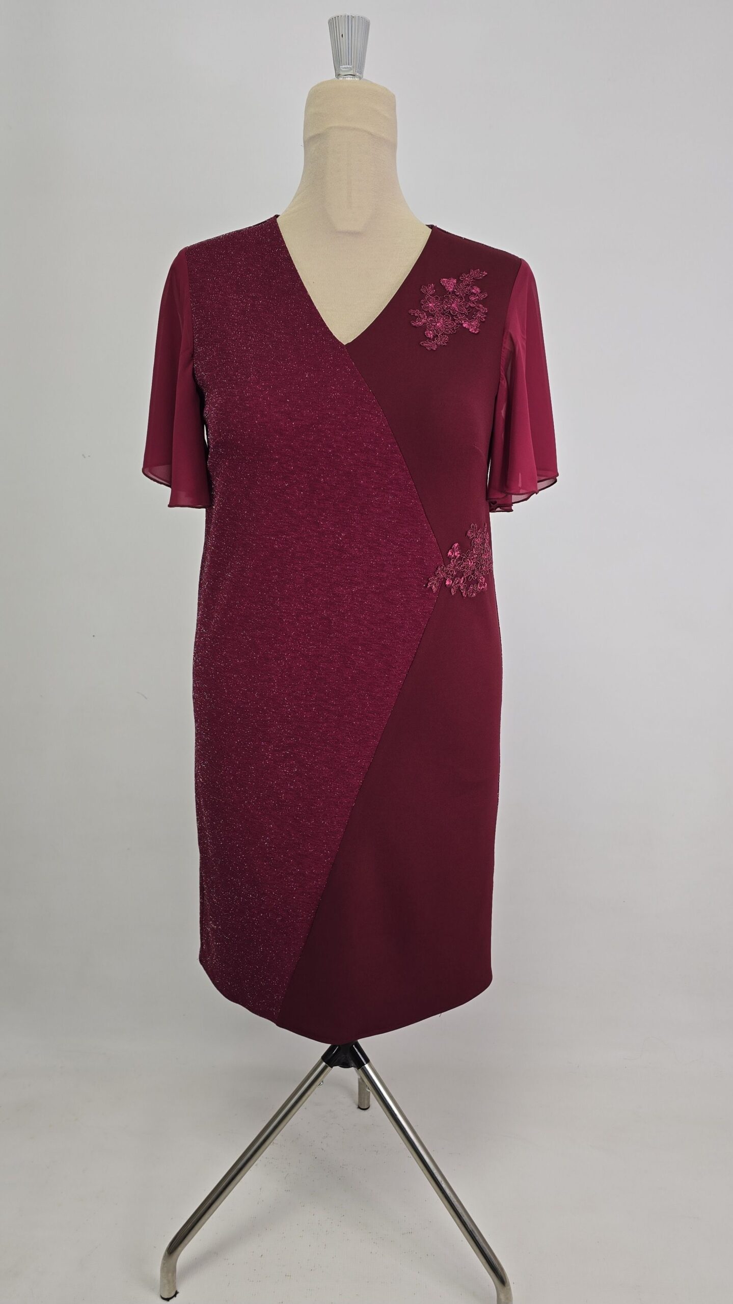 Rochie eleganta cu maneci din voal, flori din dantela cu paiete aplicate in talie si pe umar. Croiul drept asimetric in doua texturi oferă o notă de elganta potrivit pentru oricare eveniment din viata ta.
