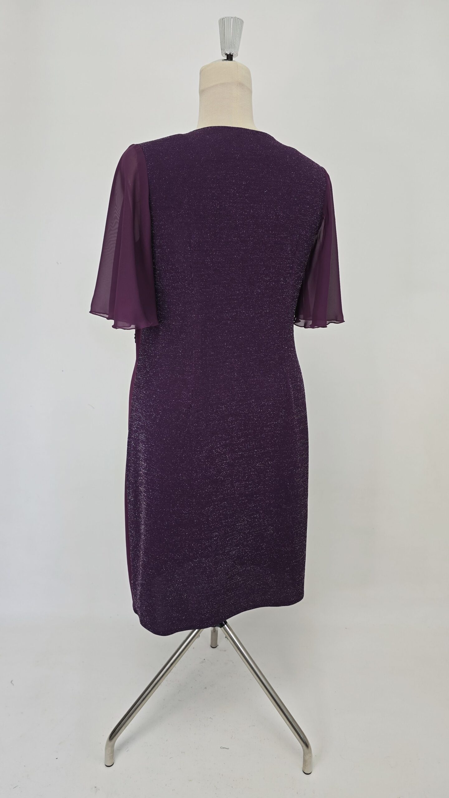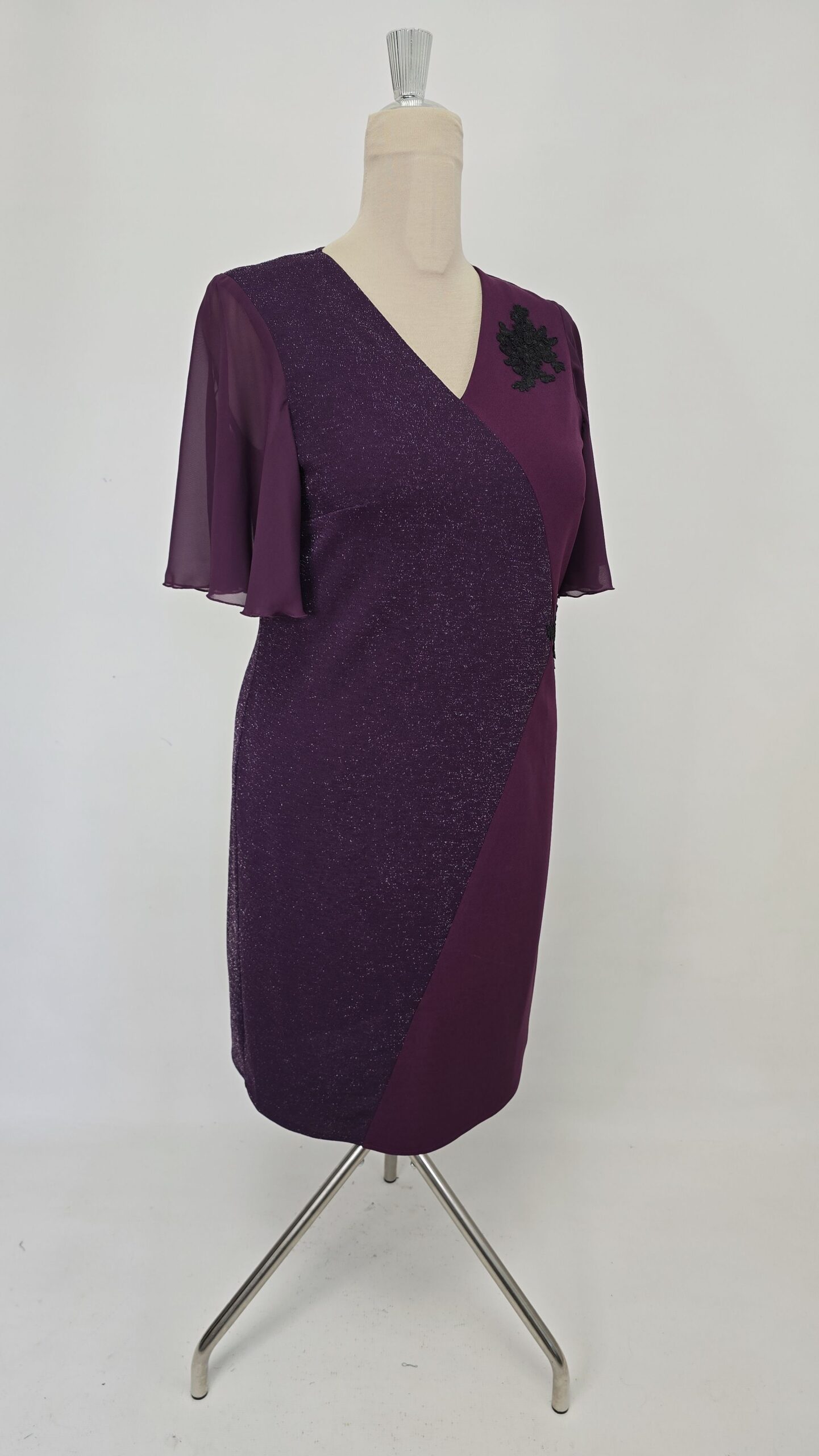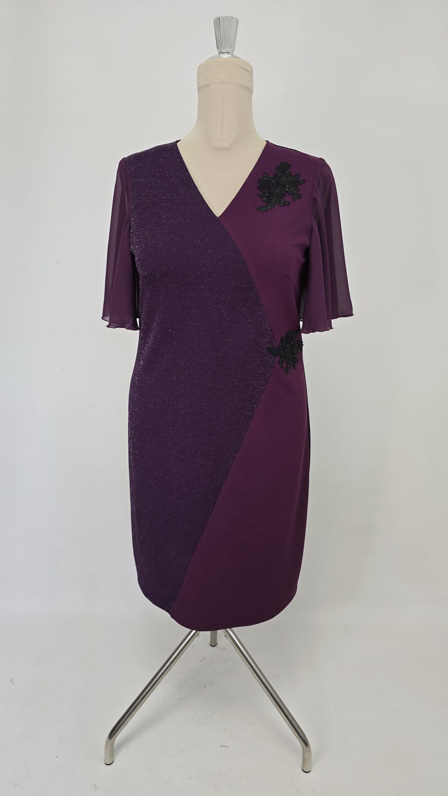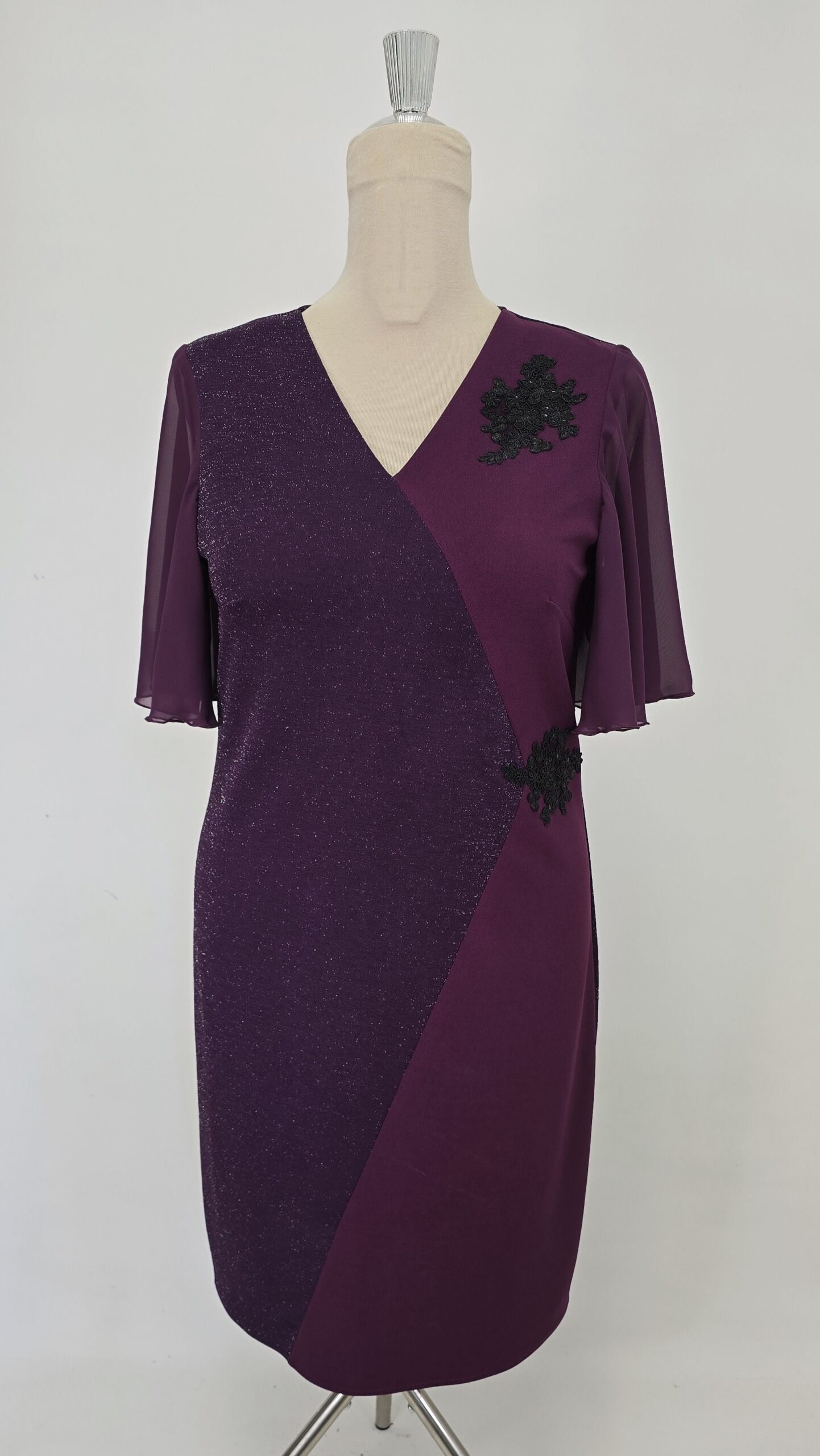 Rochie eleganta cu maneci din voal, flori din dantela cu paiete aplicate in talie si pe umar. Croiul drept asimetric in doua texturi oferă o notă de elganta potrivit pentru oricare eveniment din viata ta.