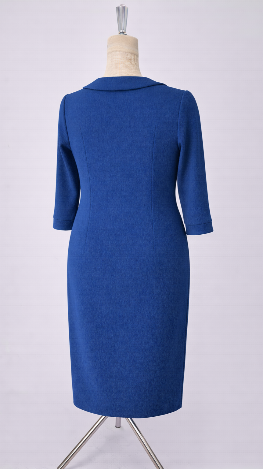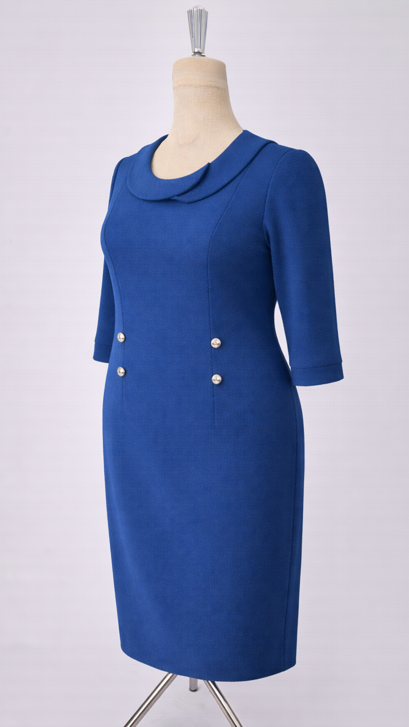 Mânecele 3/4 sunt finisate cu mansete, iar cei patru nasturi decorativi tip perlă completează zona taliei, definind discret silueta.