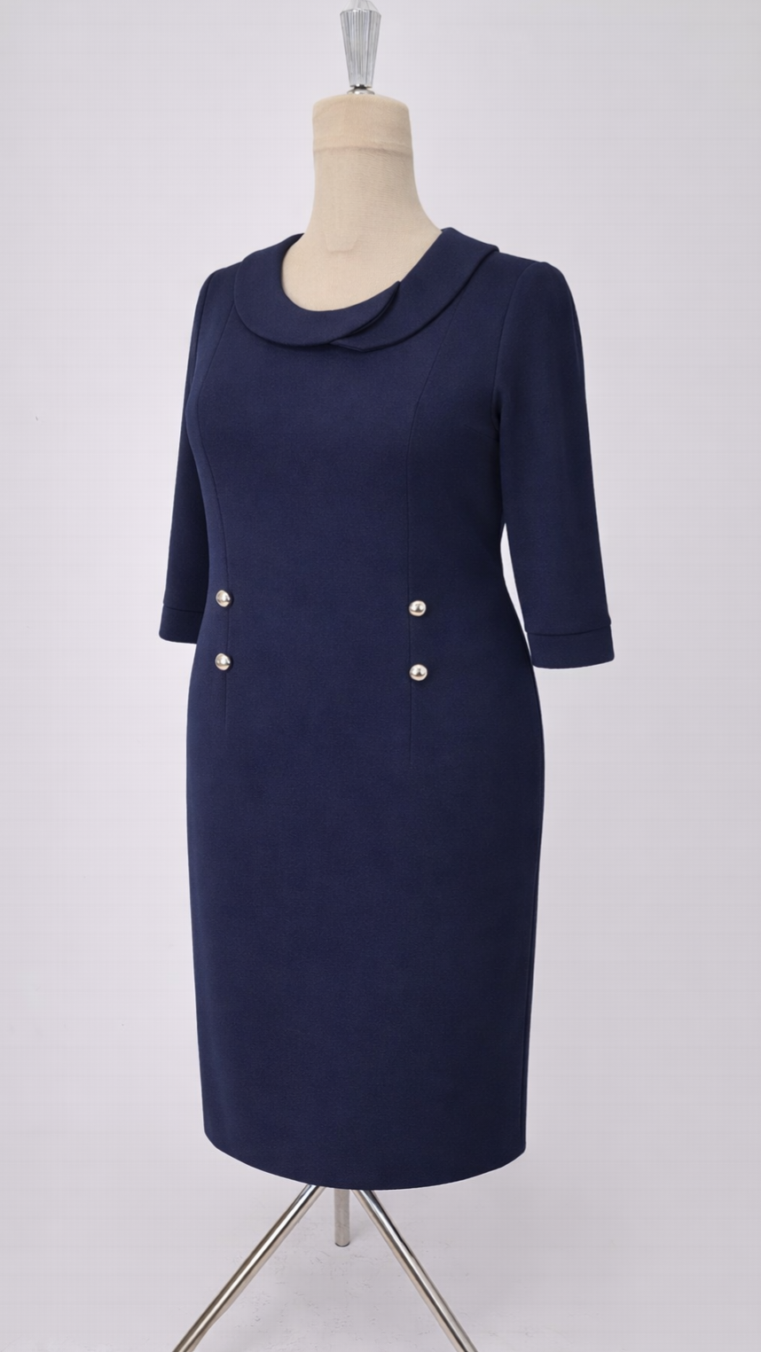 Mânecele 3/4 sunt finisate cu mansete, iar cei patru nasturi decorativi tip perlă completează zona taliei, definind discret silueta.