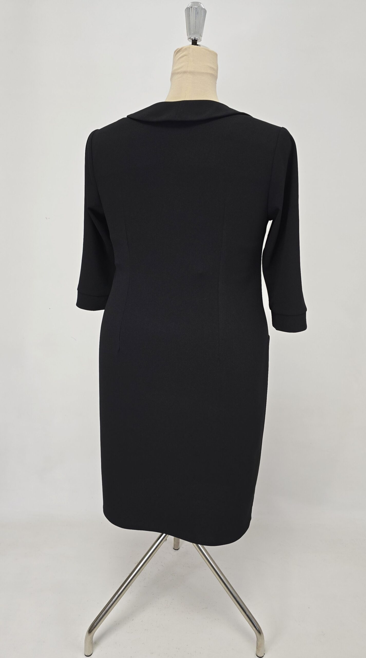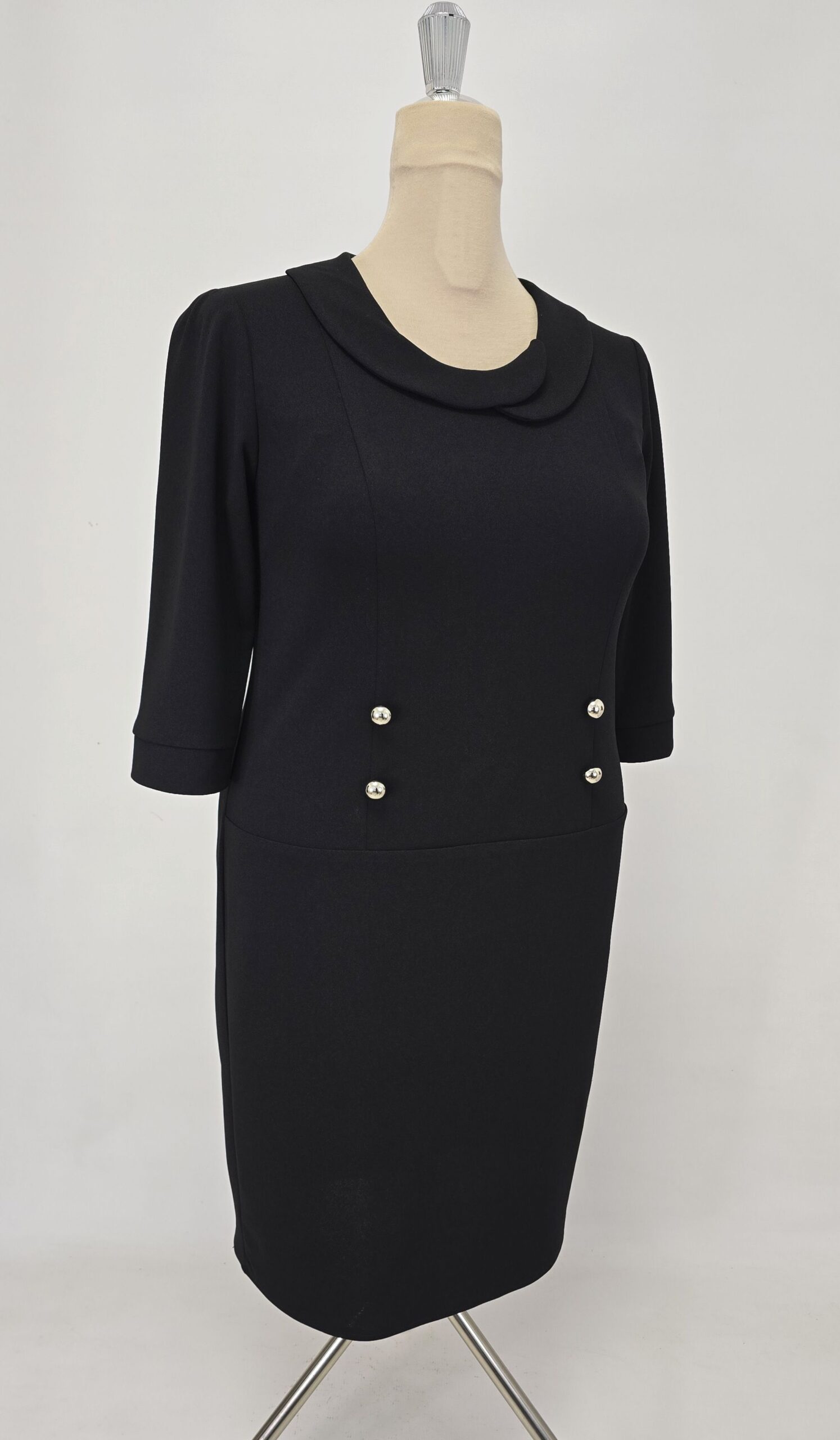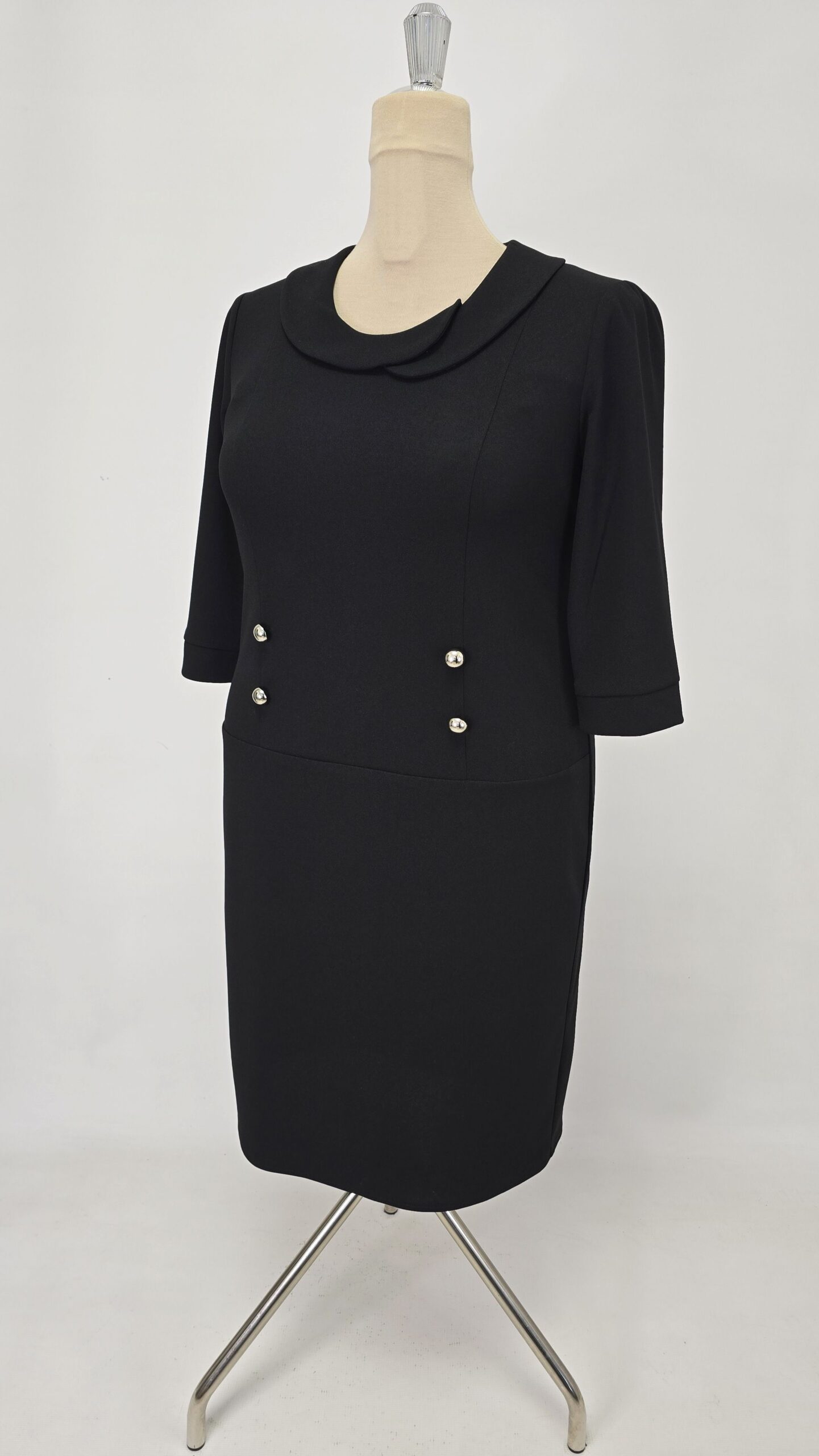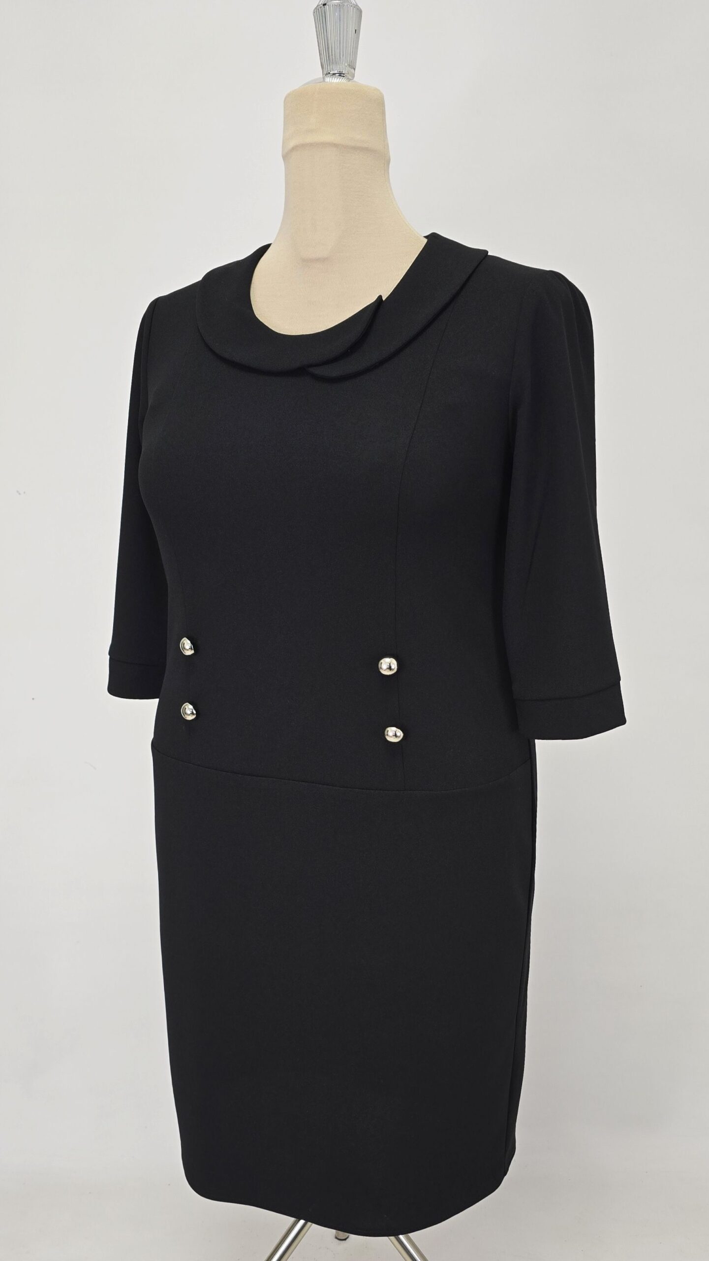 Mânecele 3/4 sunt finisate cu mansete, iar cei patru nasturi decorativi tip perlă completează zona taliei, definind discret silueta.