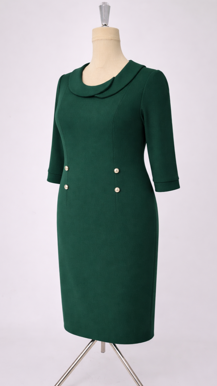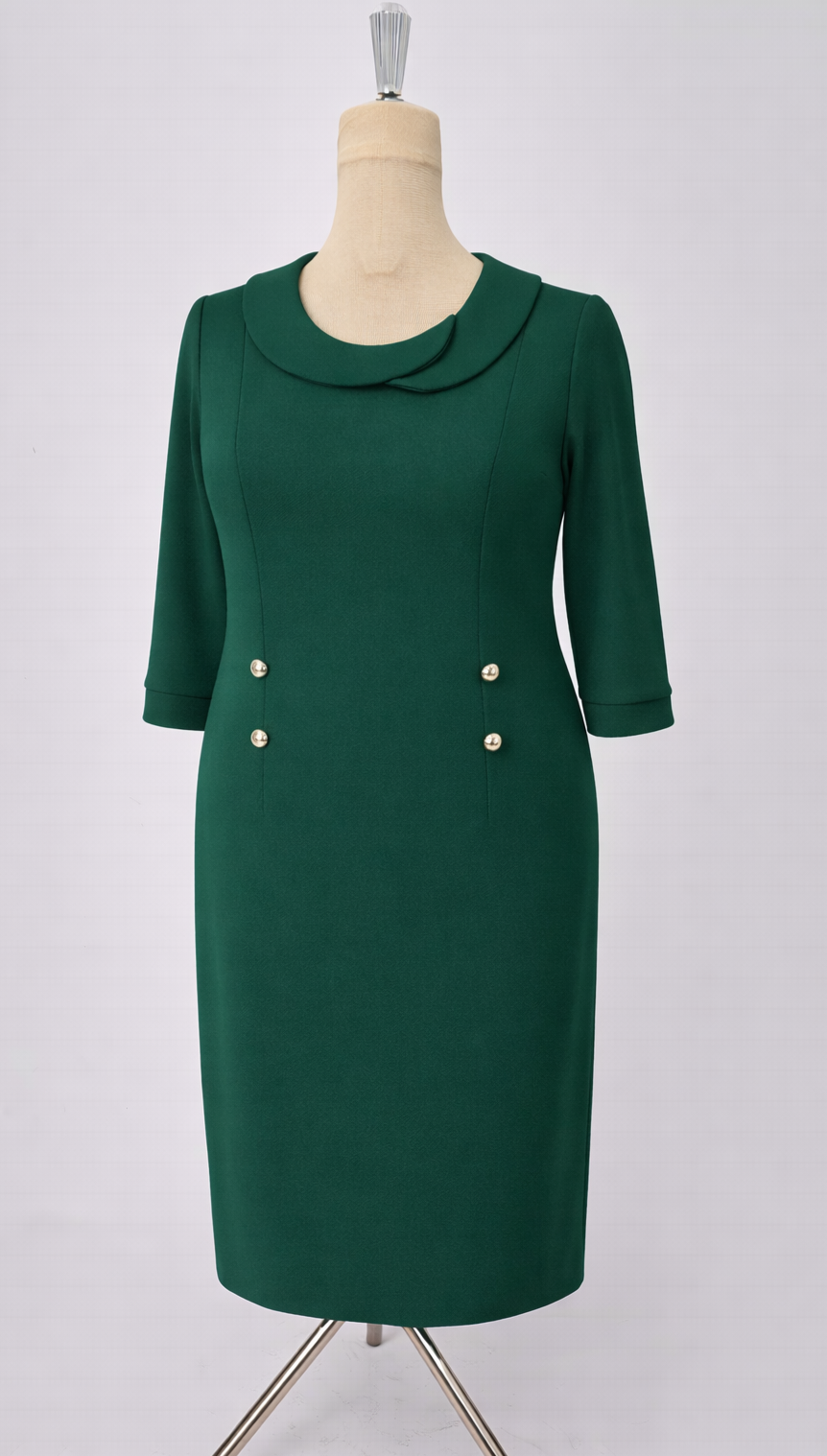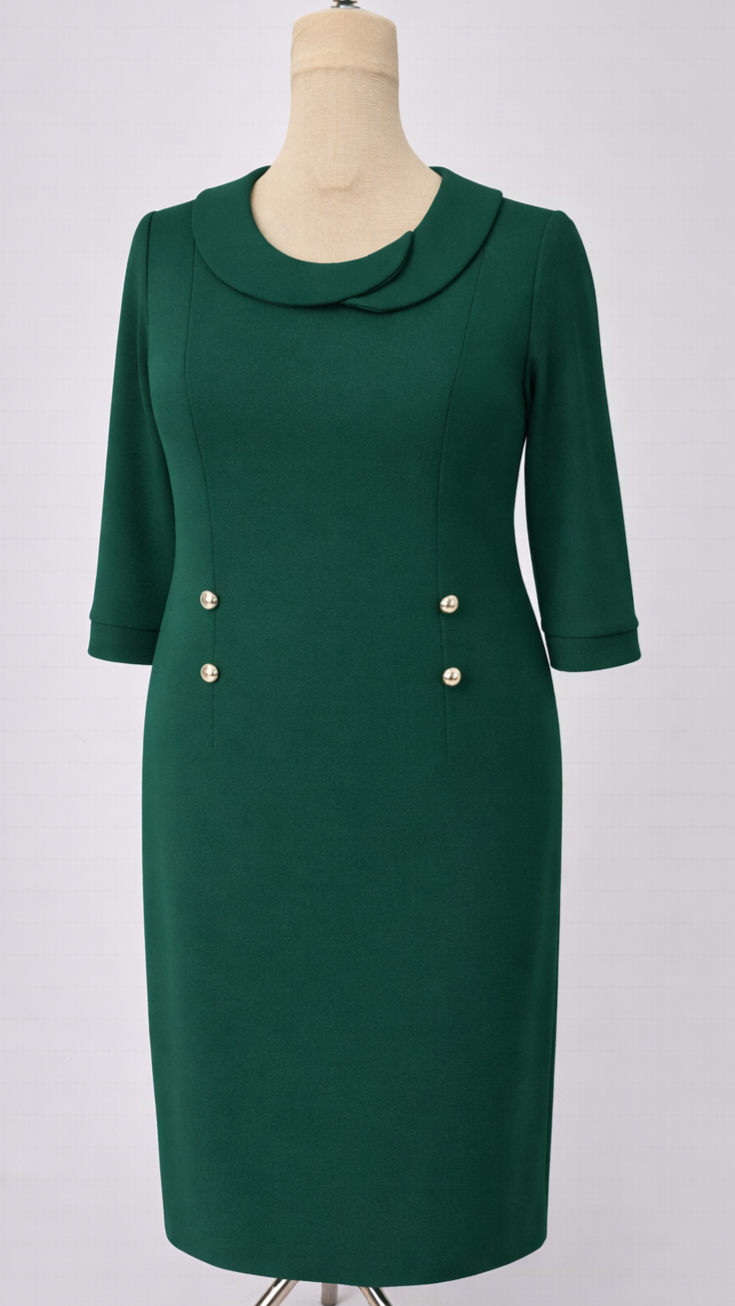 Mânecele 3/4 sunt finisate cu mansete, iar cei patru nasturi decorativi tip perlă completează zona taliei, definind discret silueta.