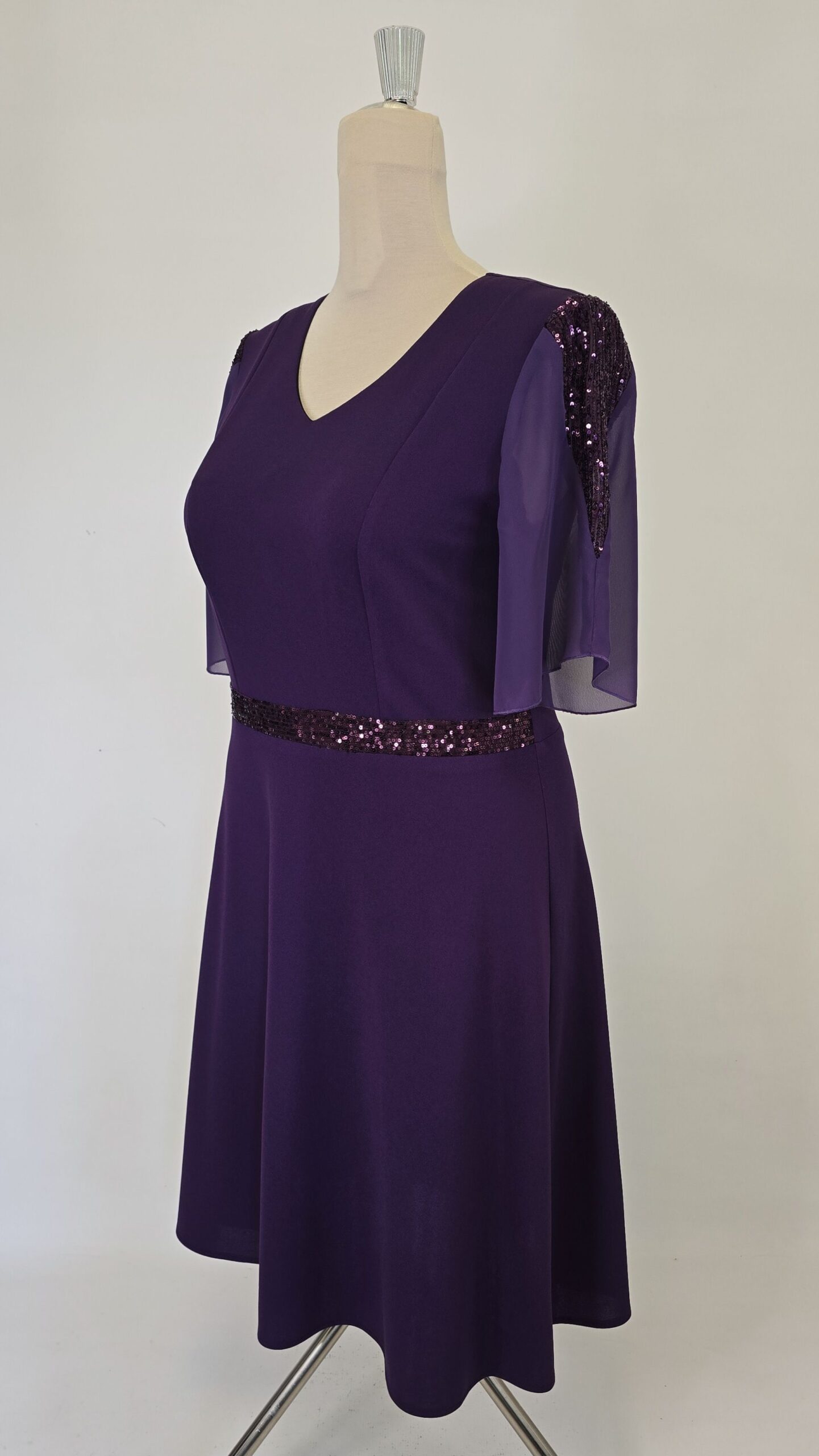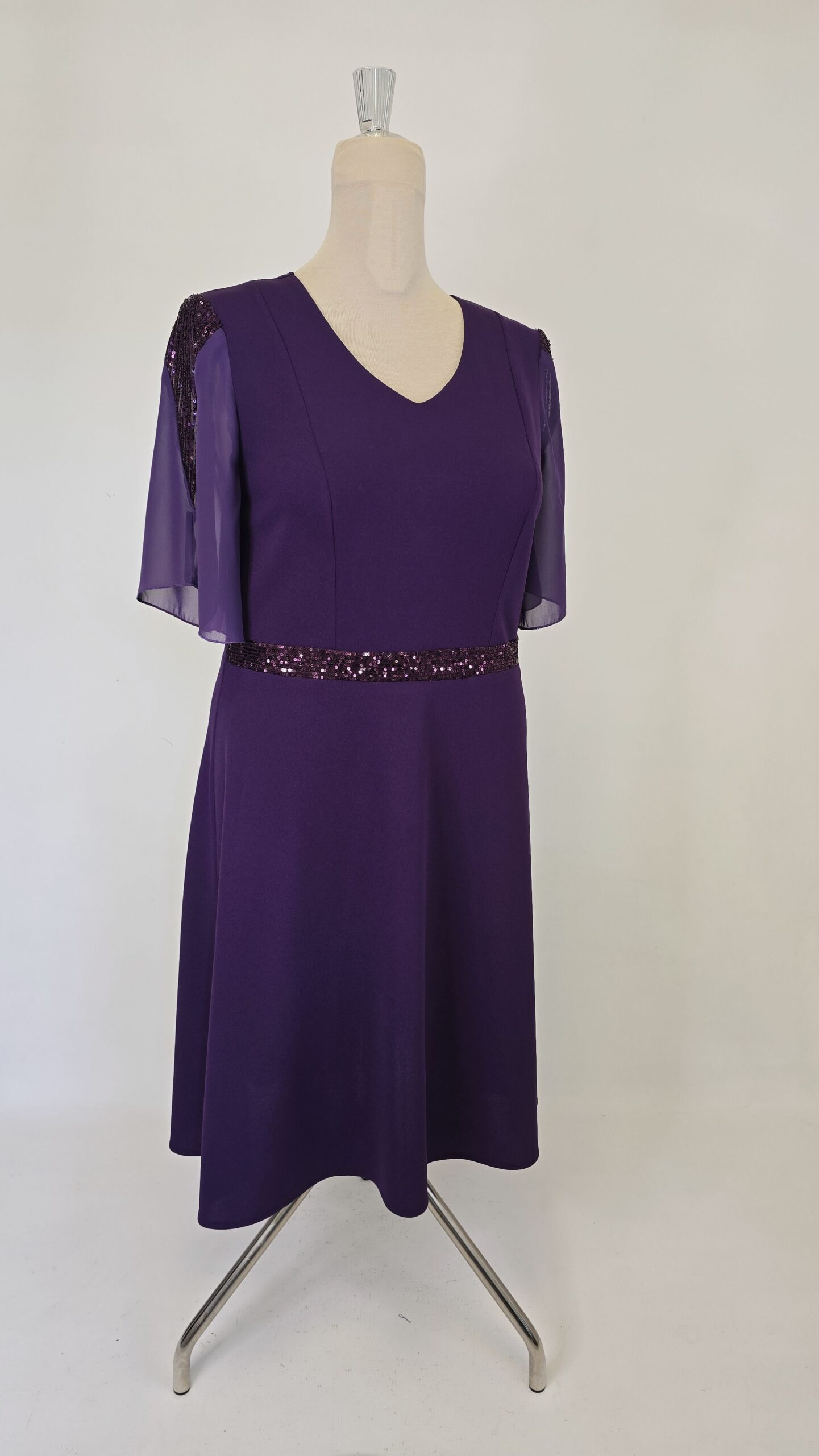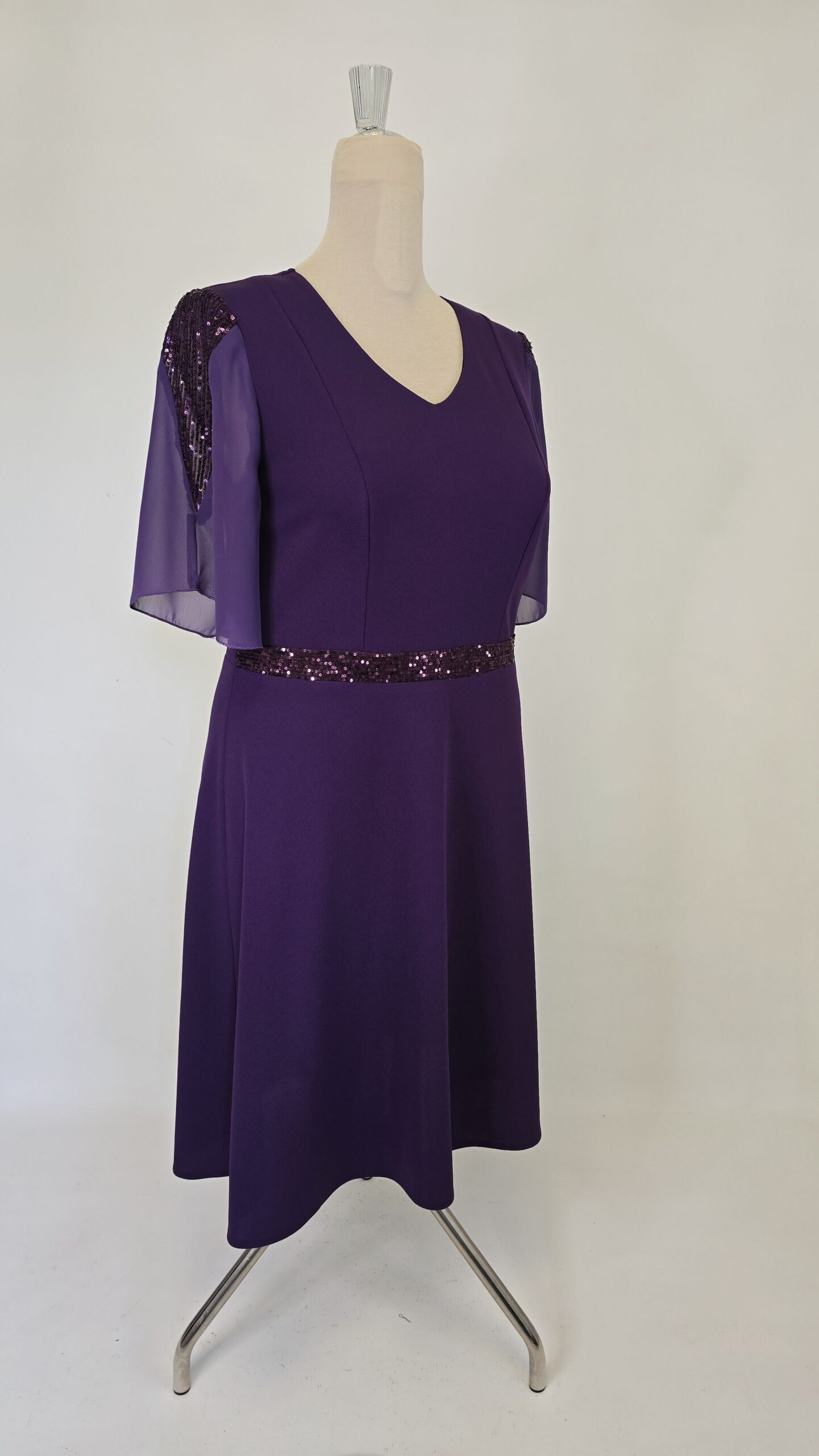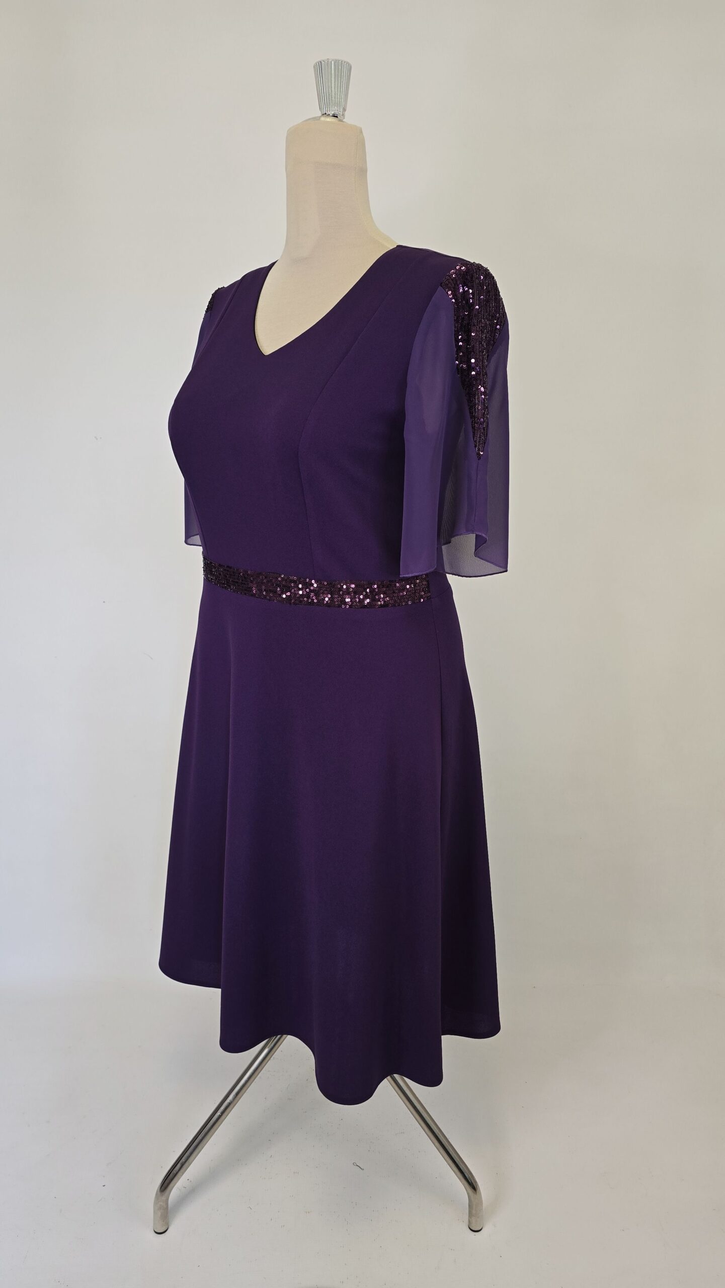 Rochie eleganta cu banda din paiete aplicata in talie si maneci din voal lejere cu insertie in V din paiete. Aceasta rochie adaugă un plus de stil oricărei ocazii.