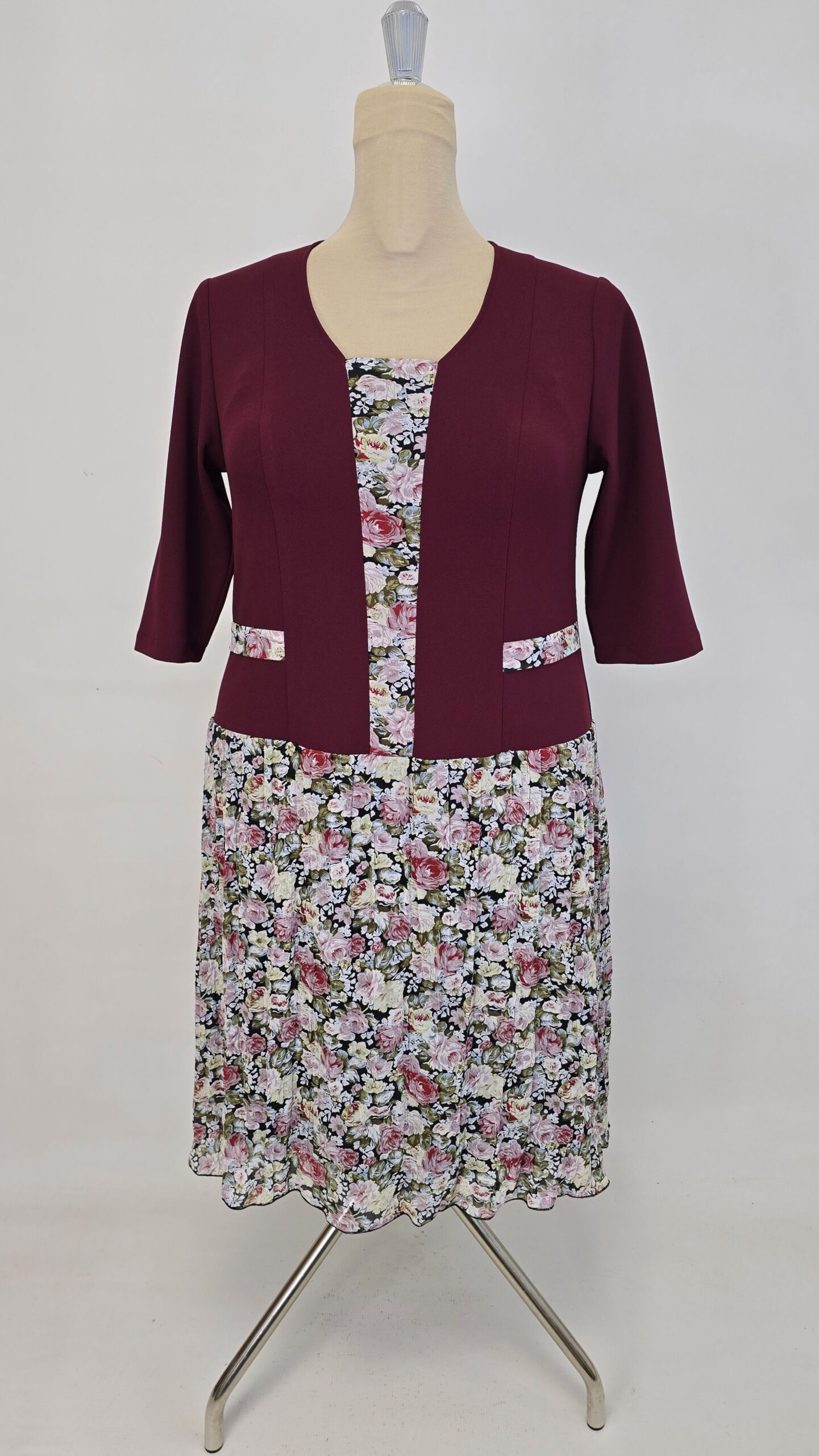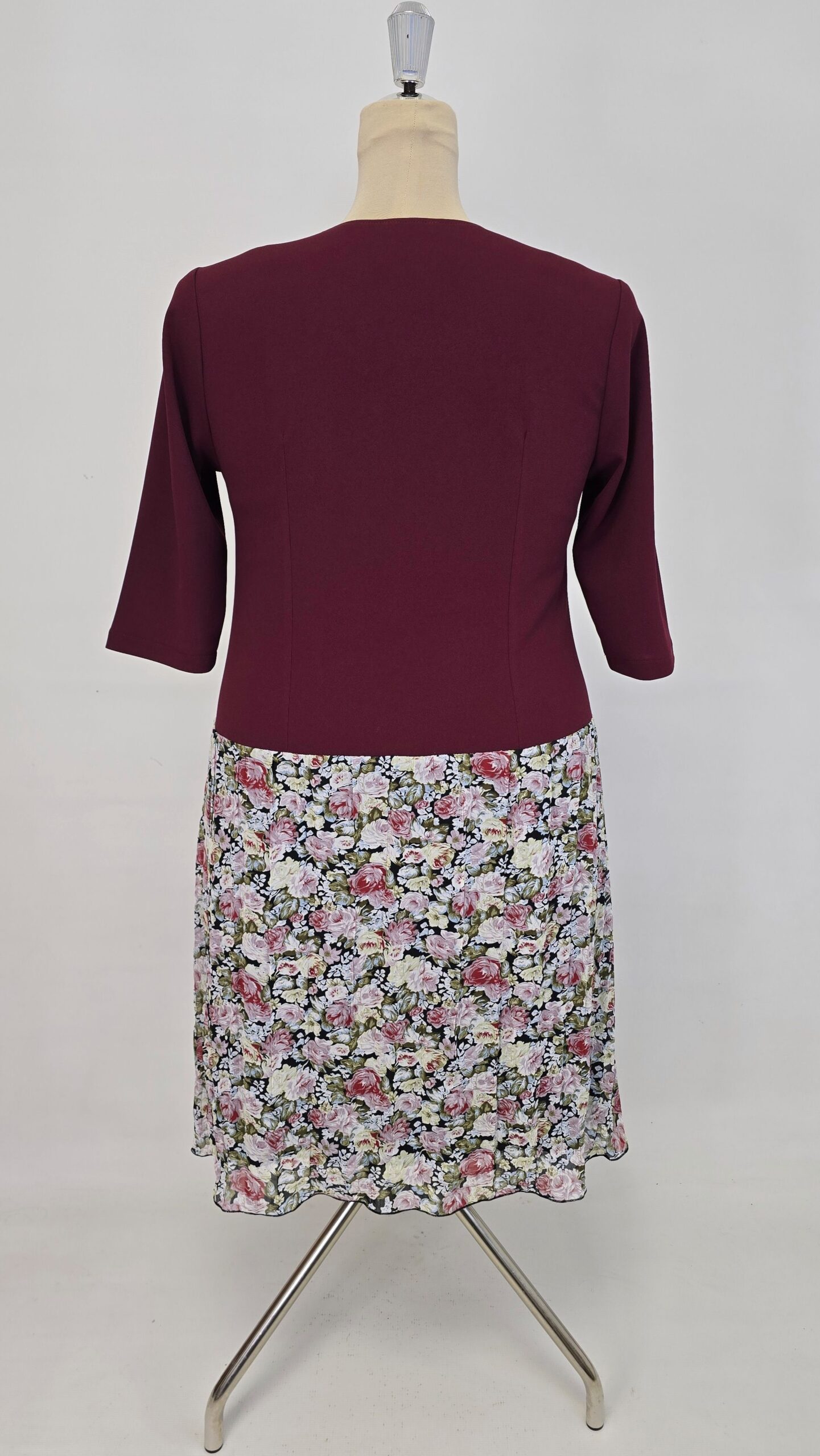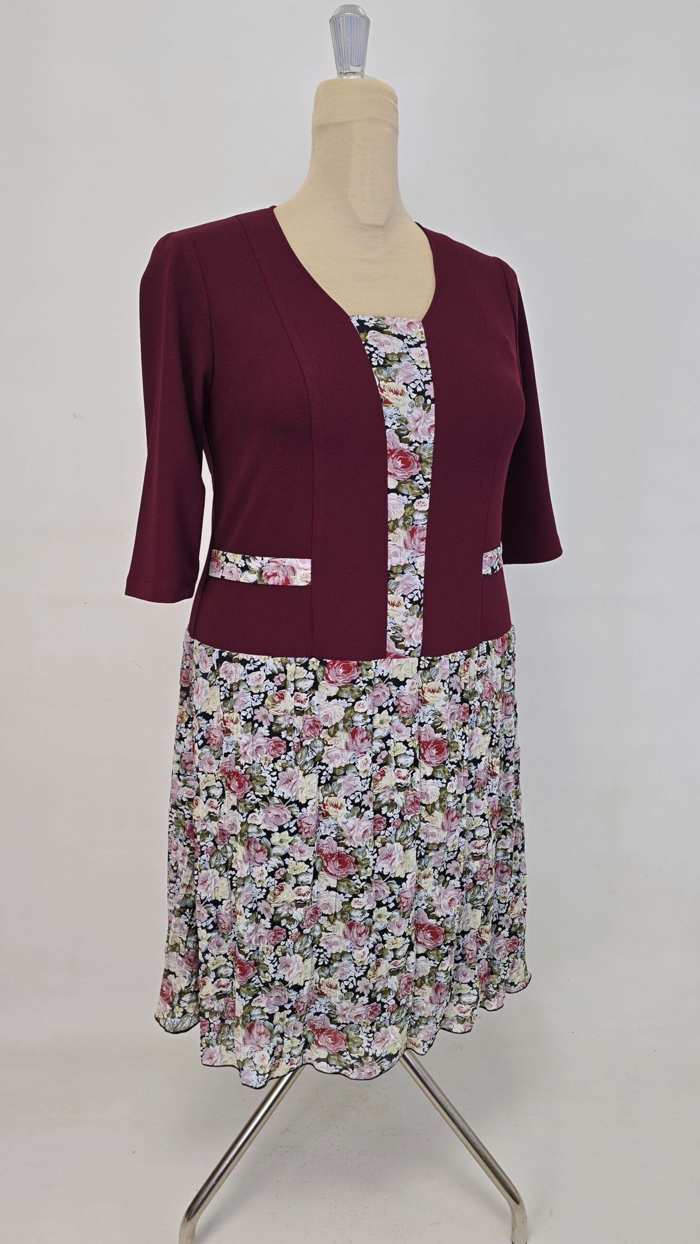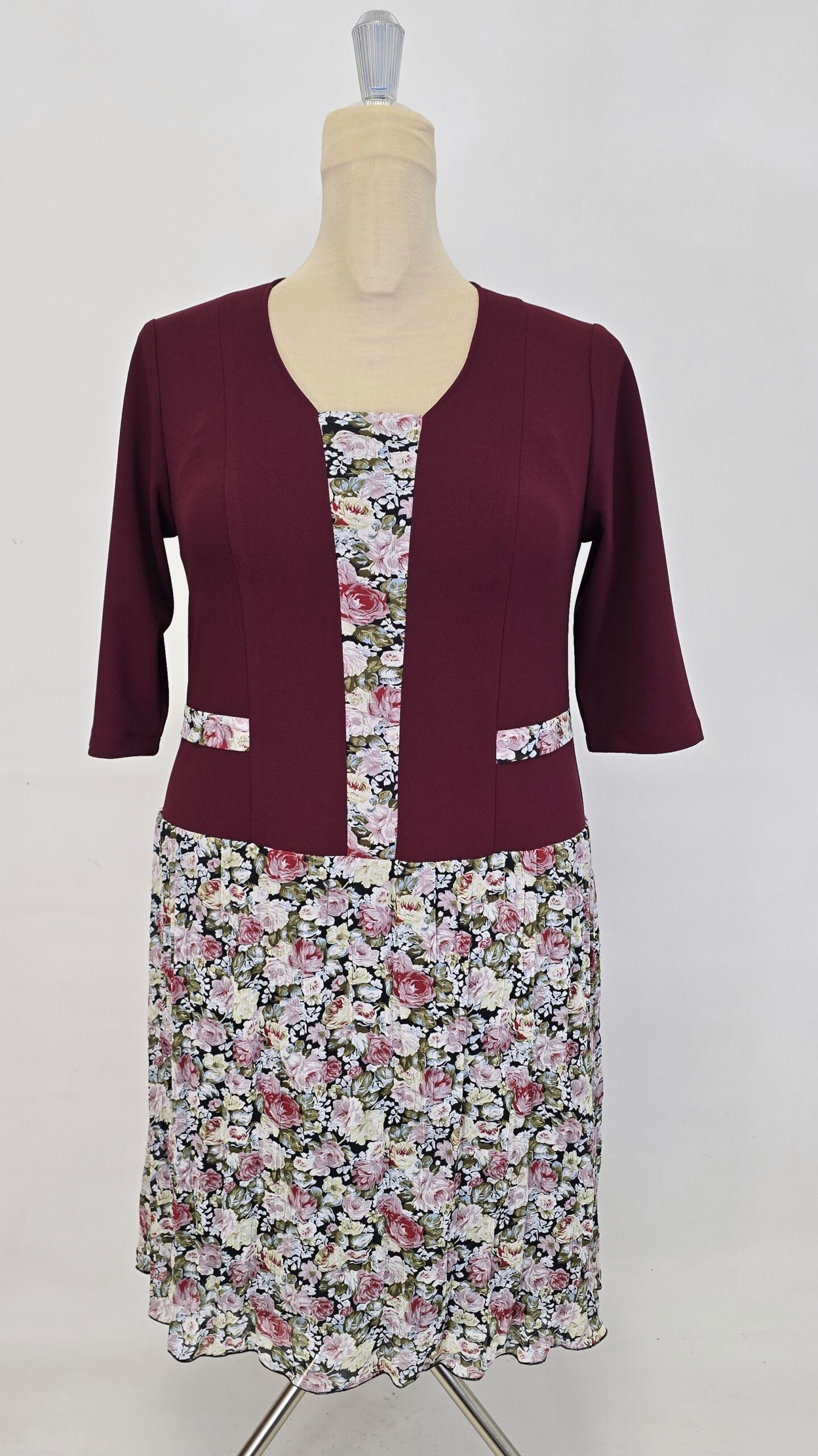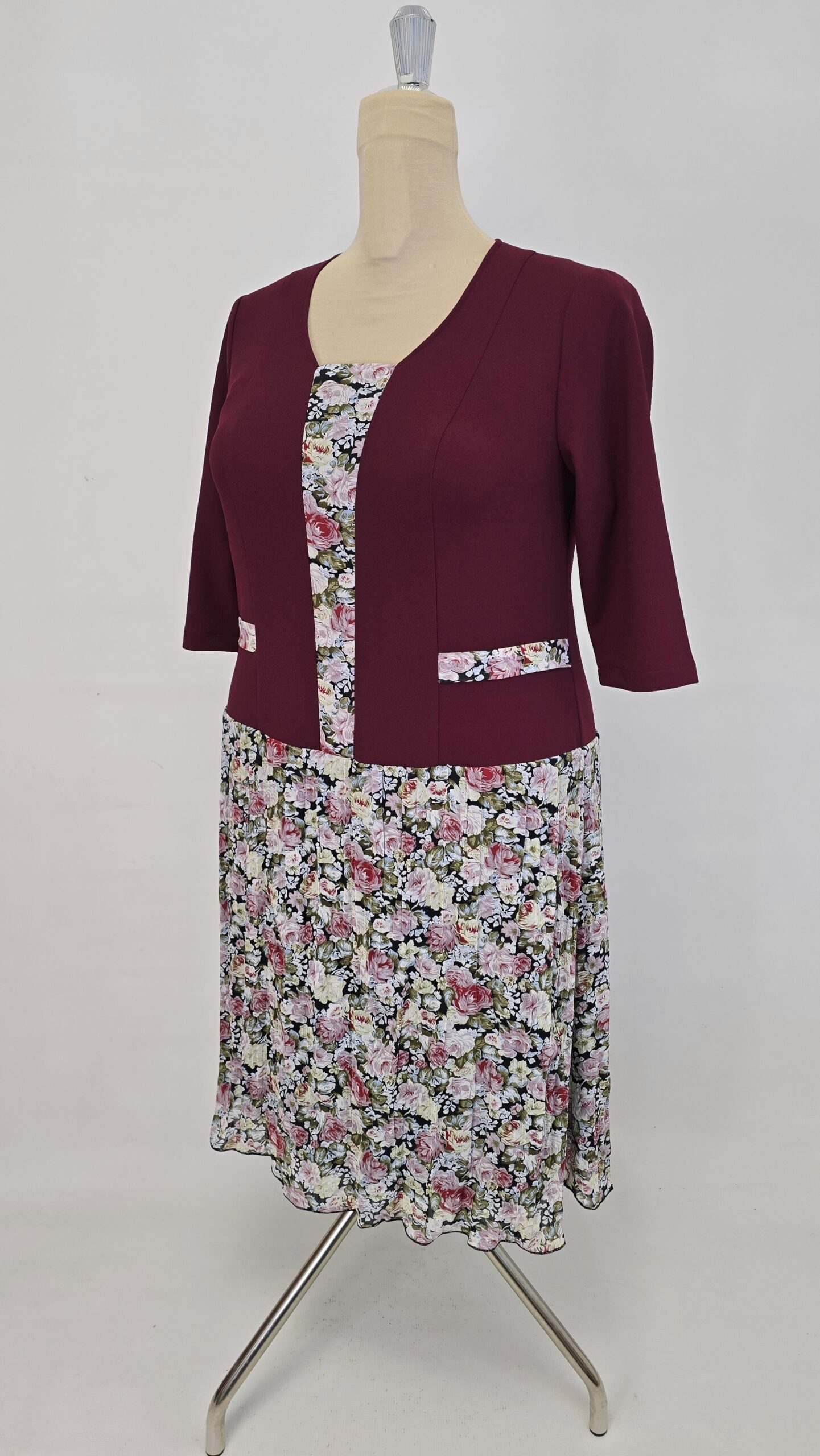 Rochie cu bustul tip sacou, insertie si clapite dublate cu material, fusta în A din voal gofrat nesifonabil si căptușeală milaneza, imita un set din doua piese sacou și fusta.