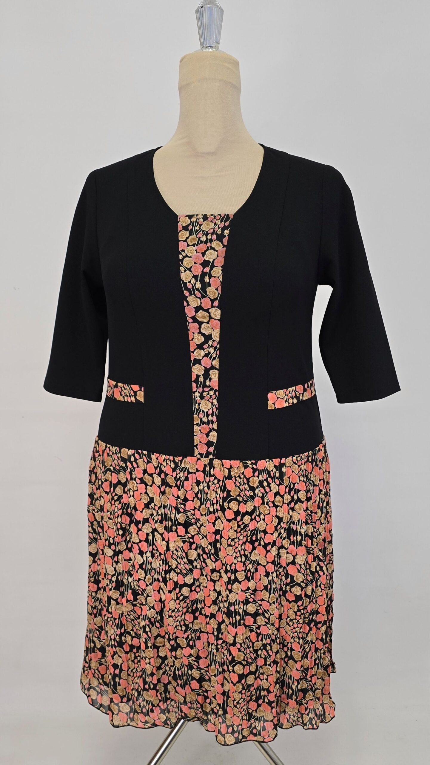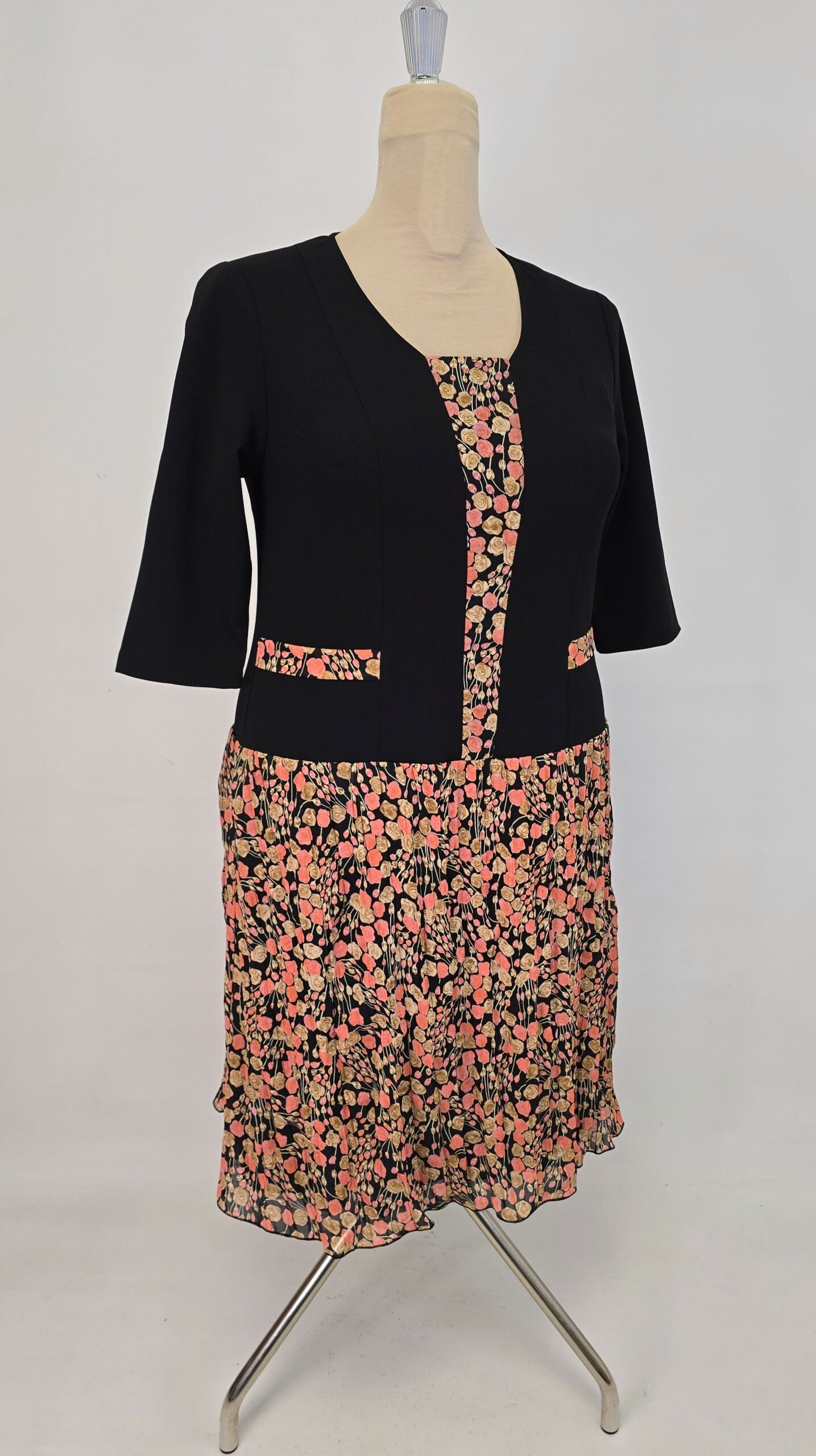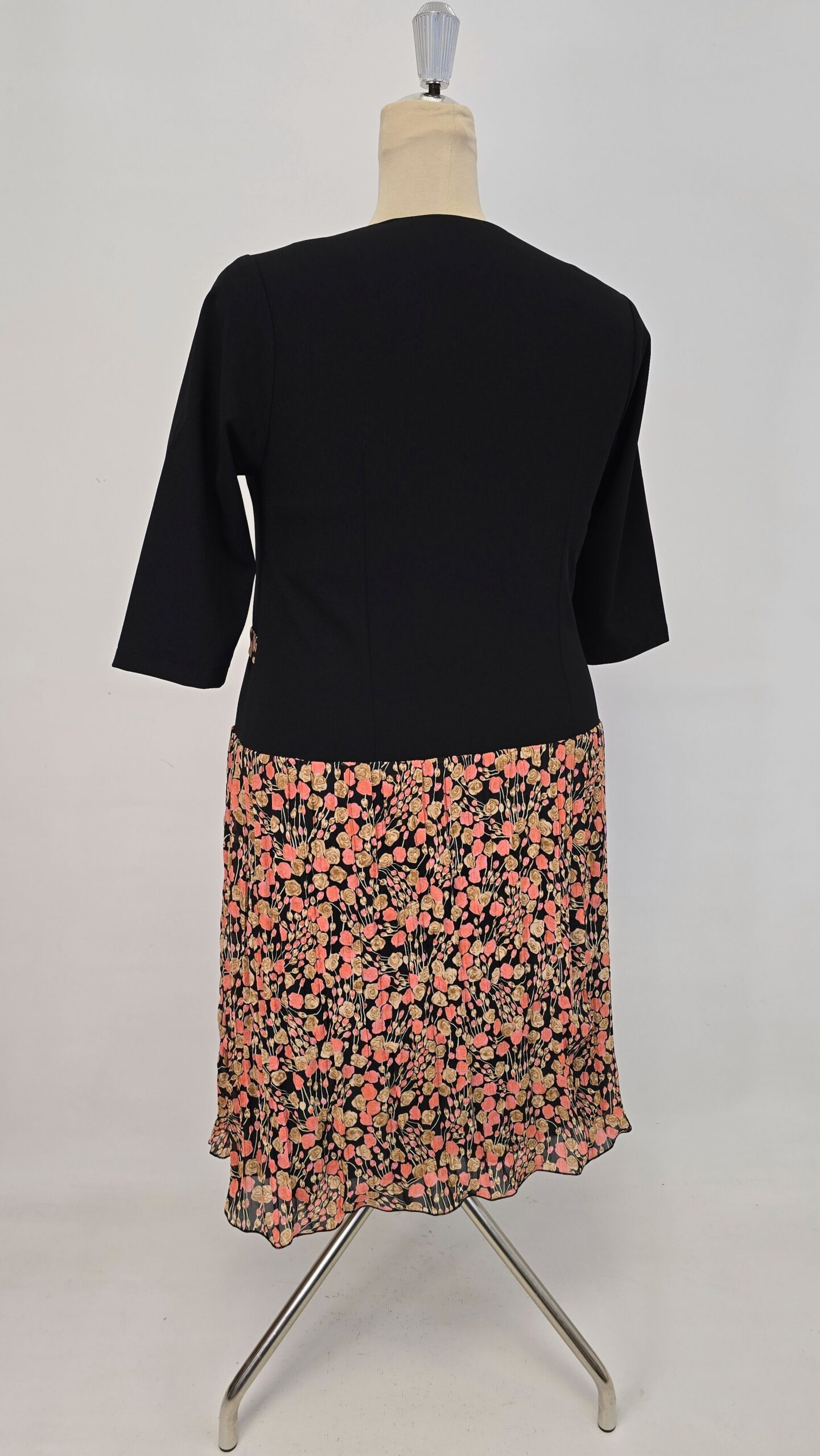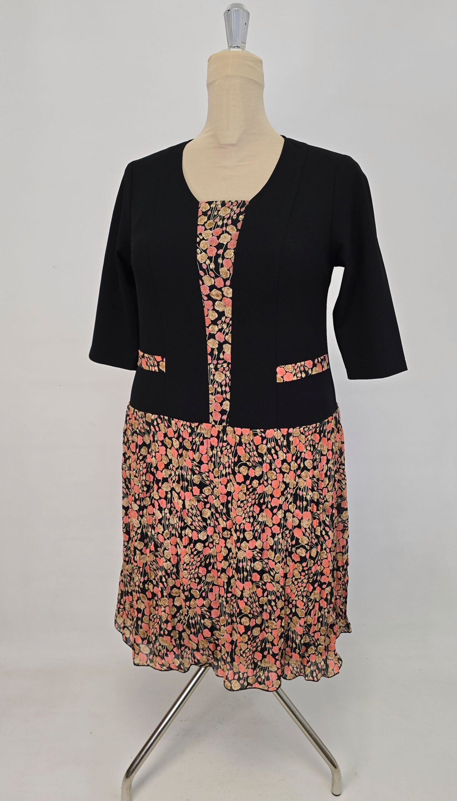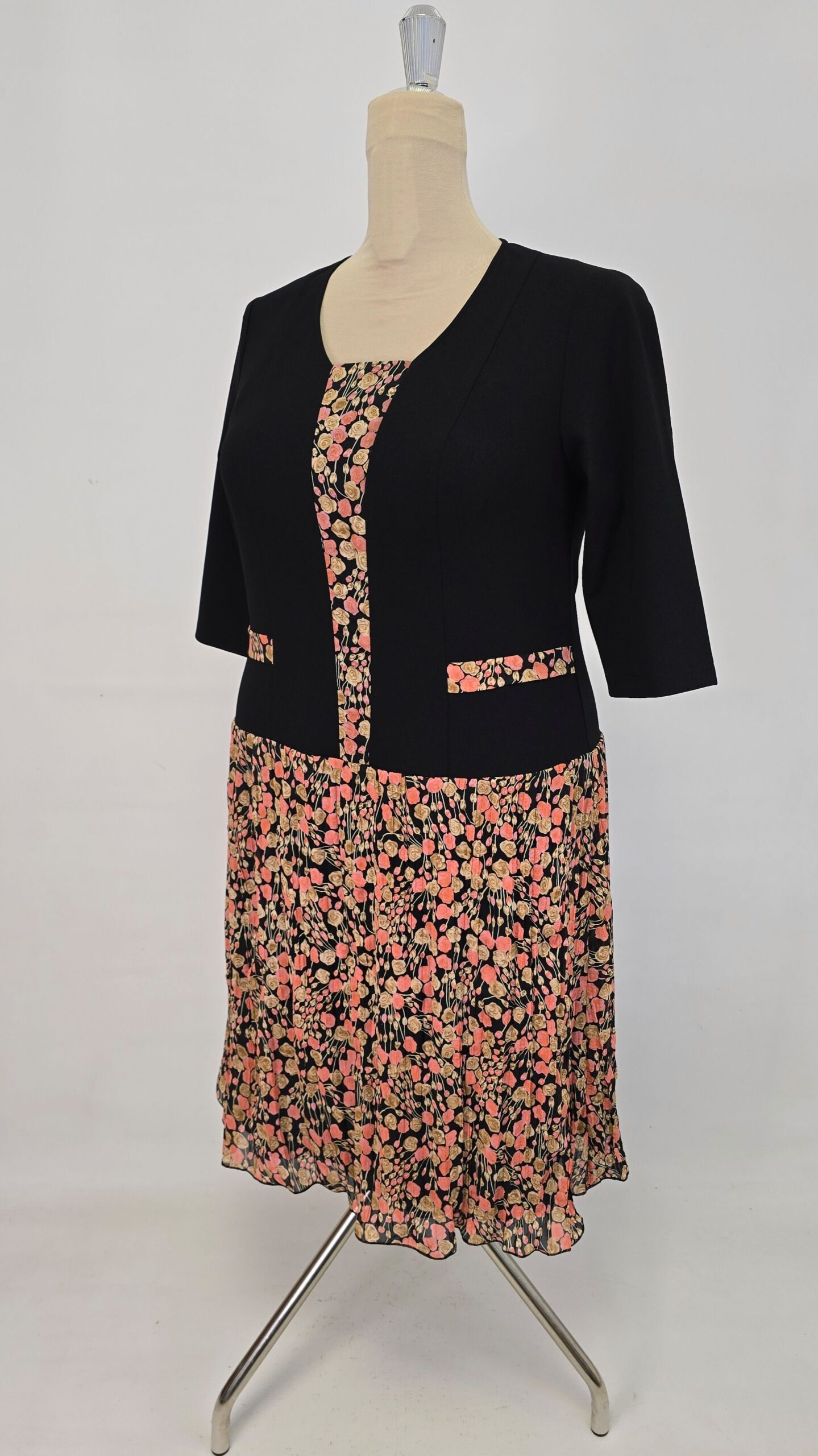 Rochie cu bustul tip sacou, insertie si clapite dublate cu material, fusta în A din voal gofrat nesifonabil si  căptușeală milaneza, imita un set din doua piese sacou și fusta.