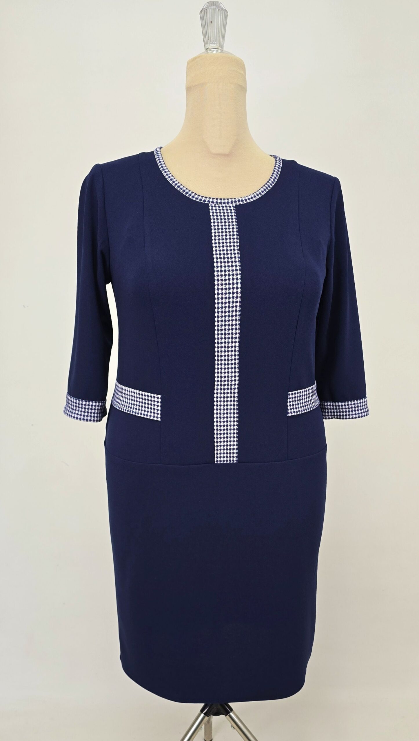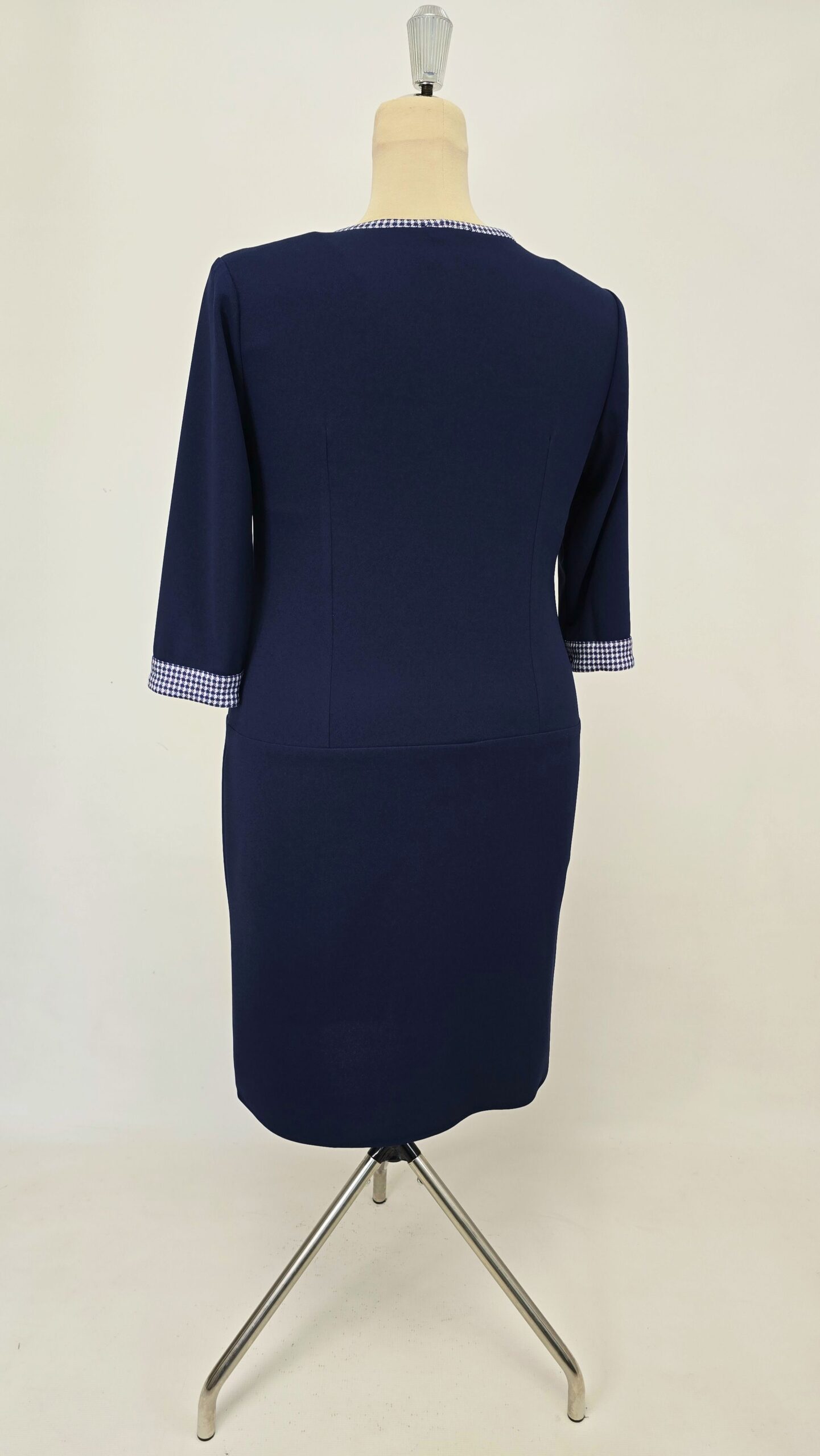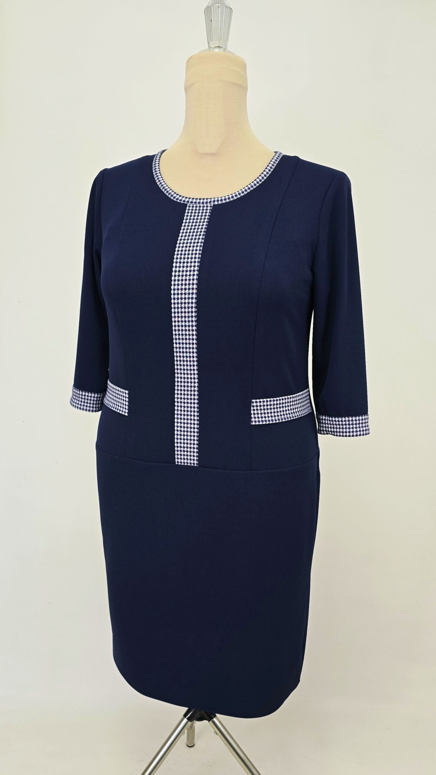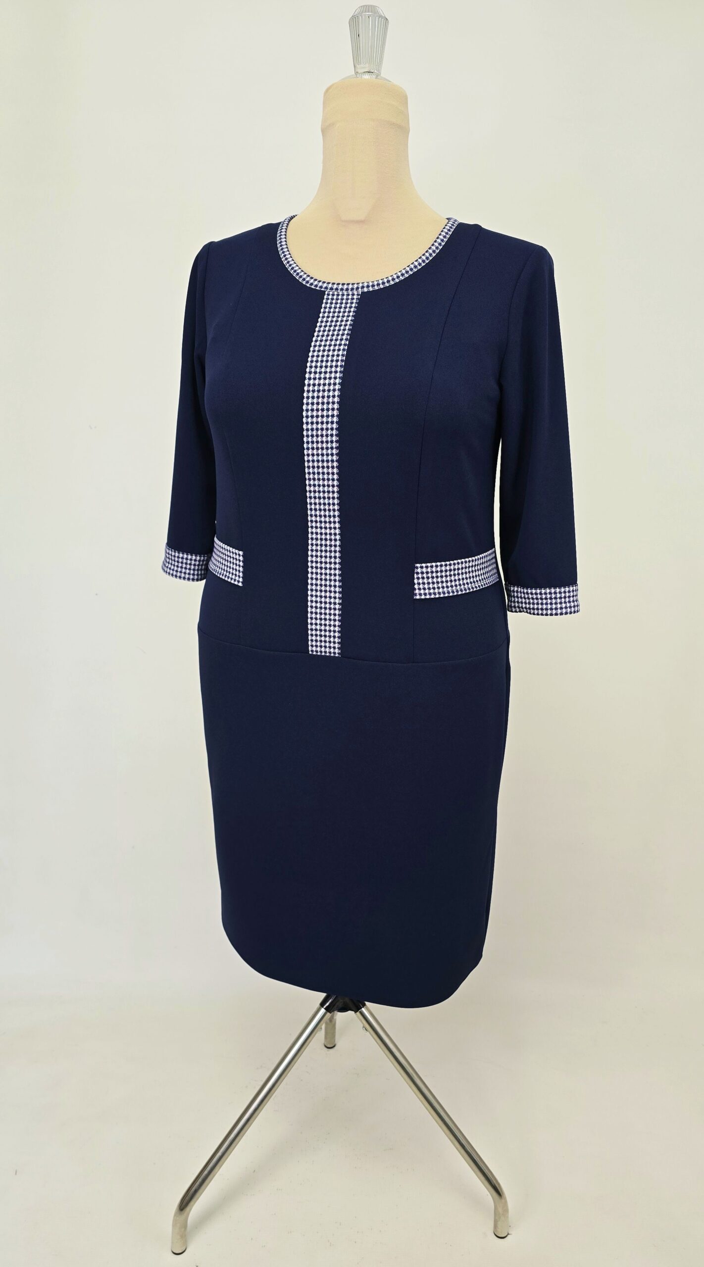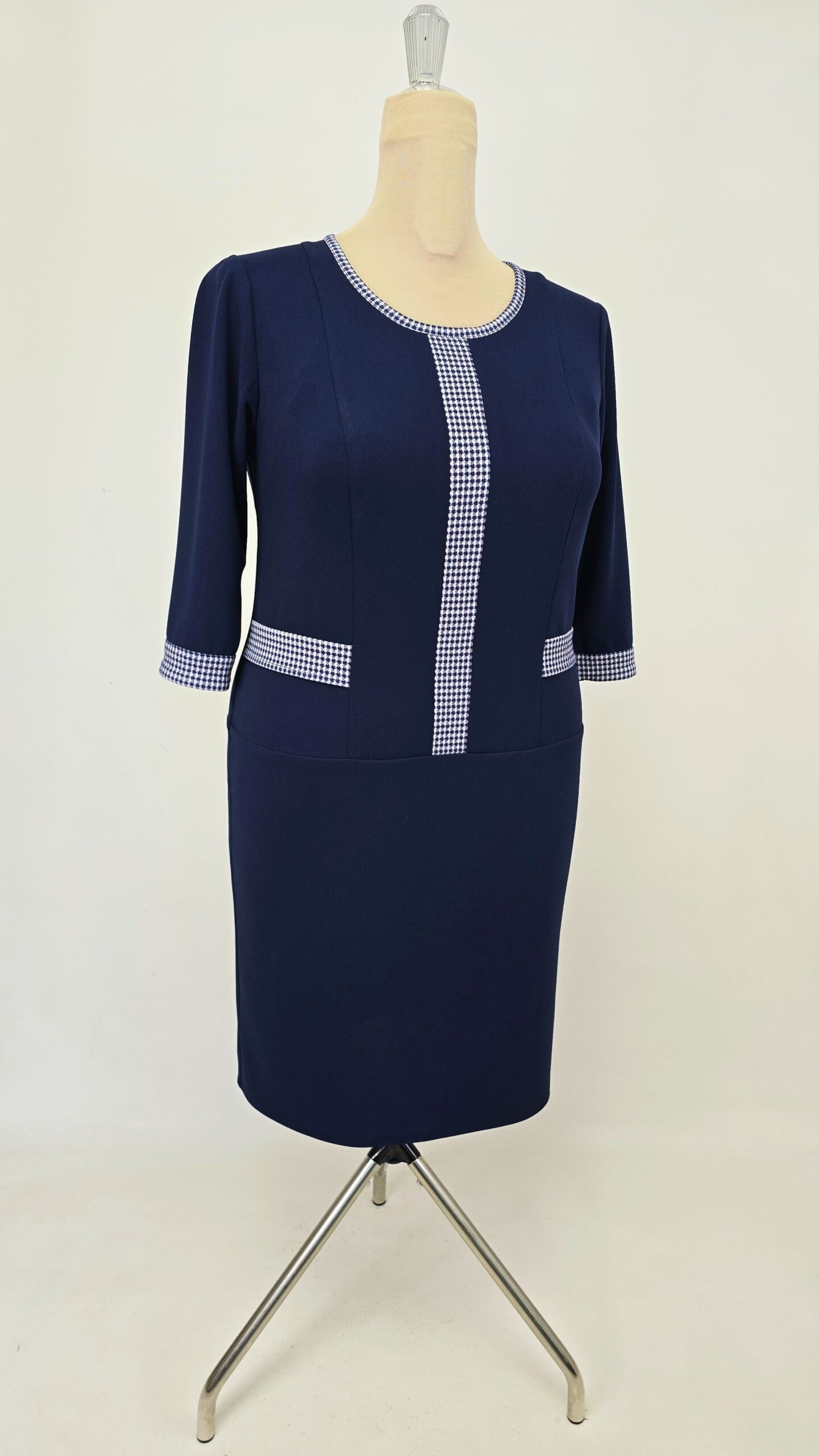 Rochie casual din crep elastic, accesorizata cu insertii si garnituri alb-bleumarin, imita foarte bine un set de doua piese sacou și fusta.