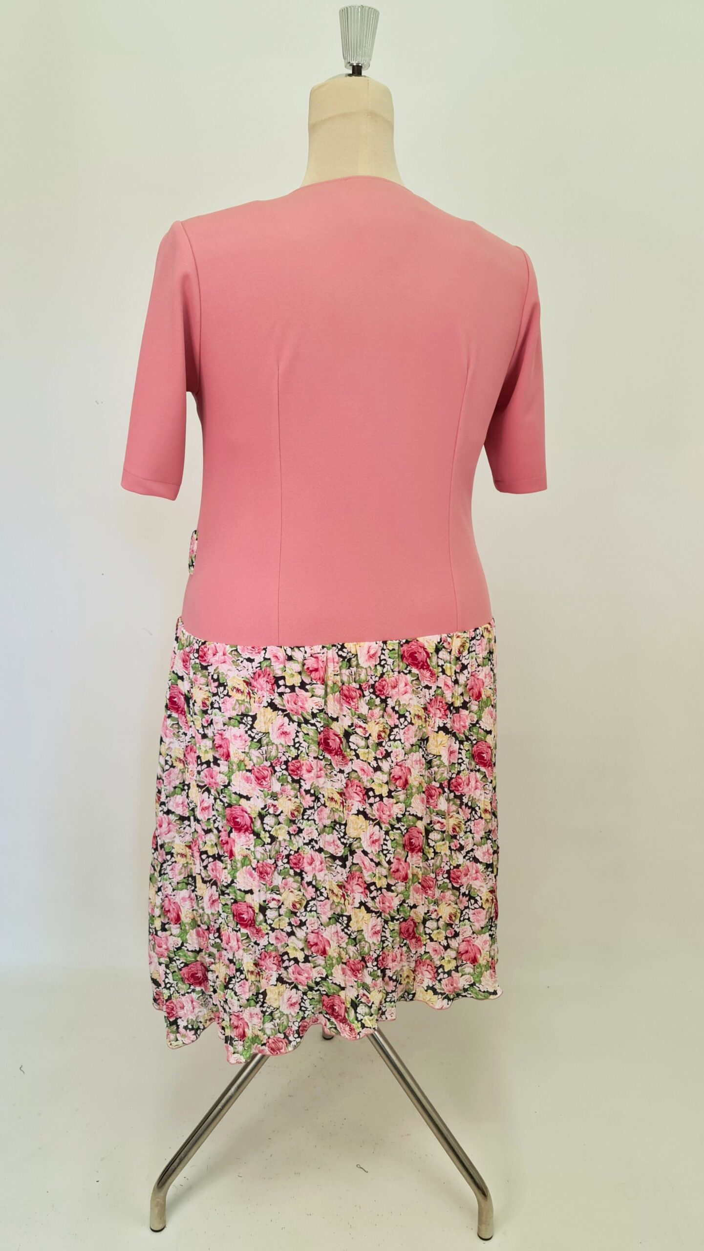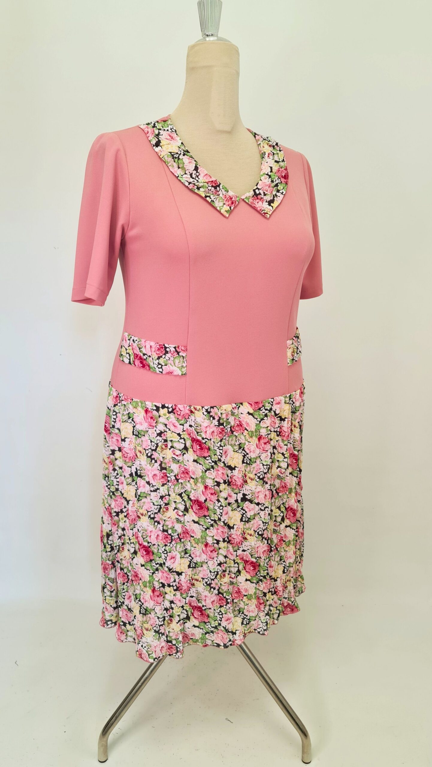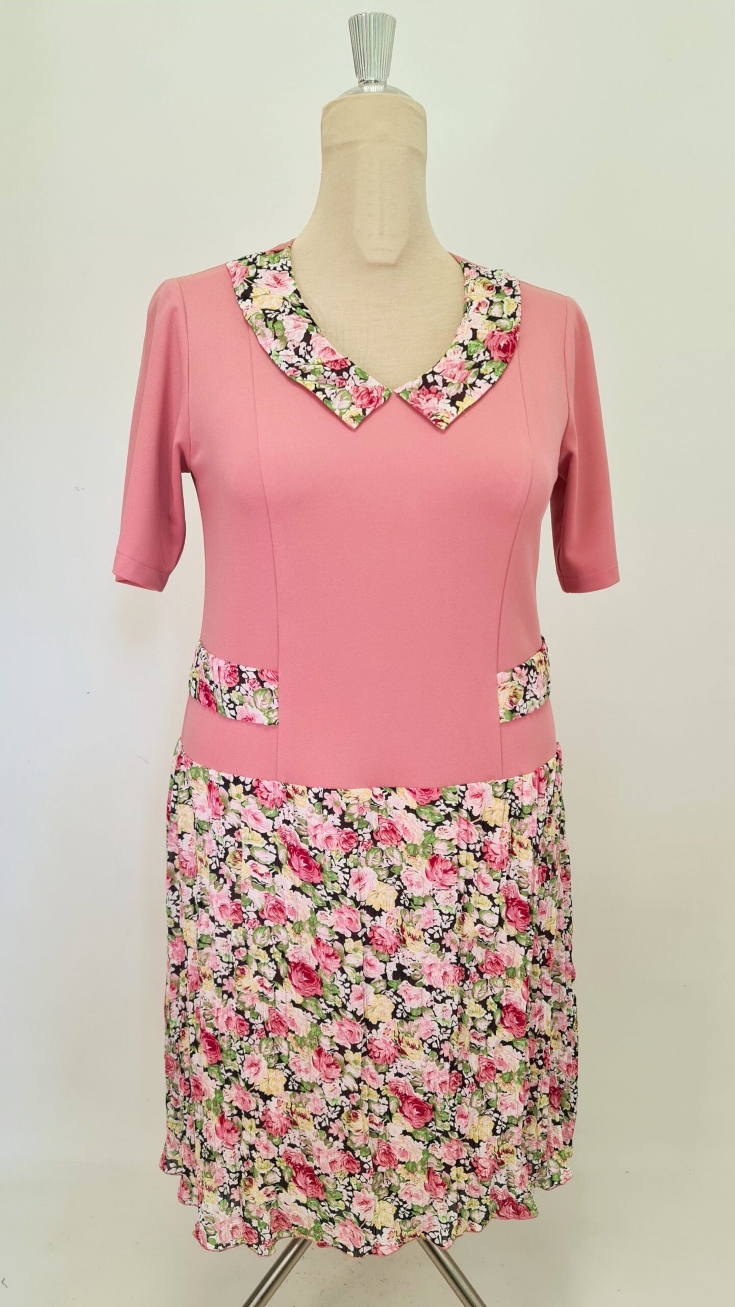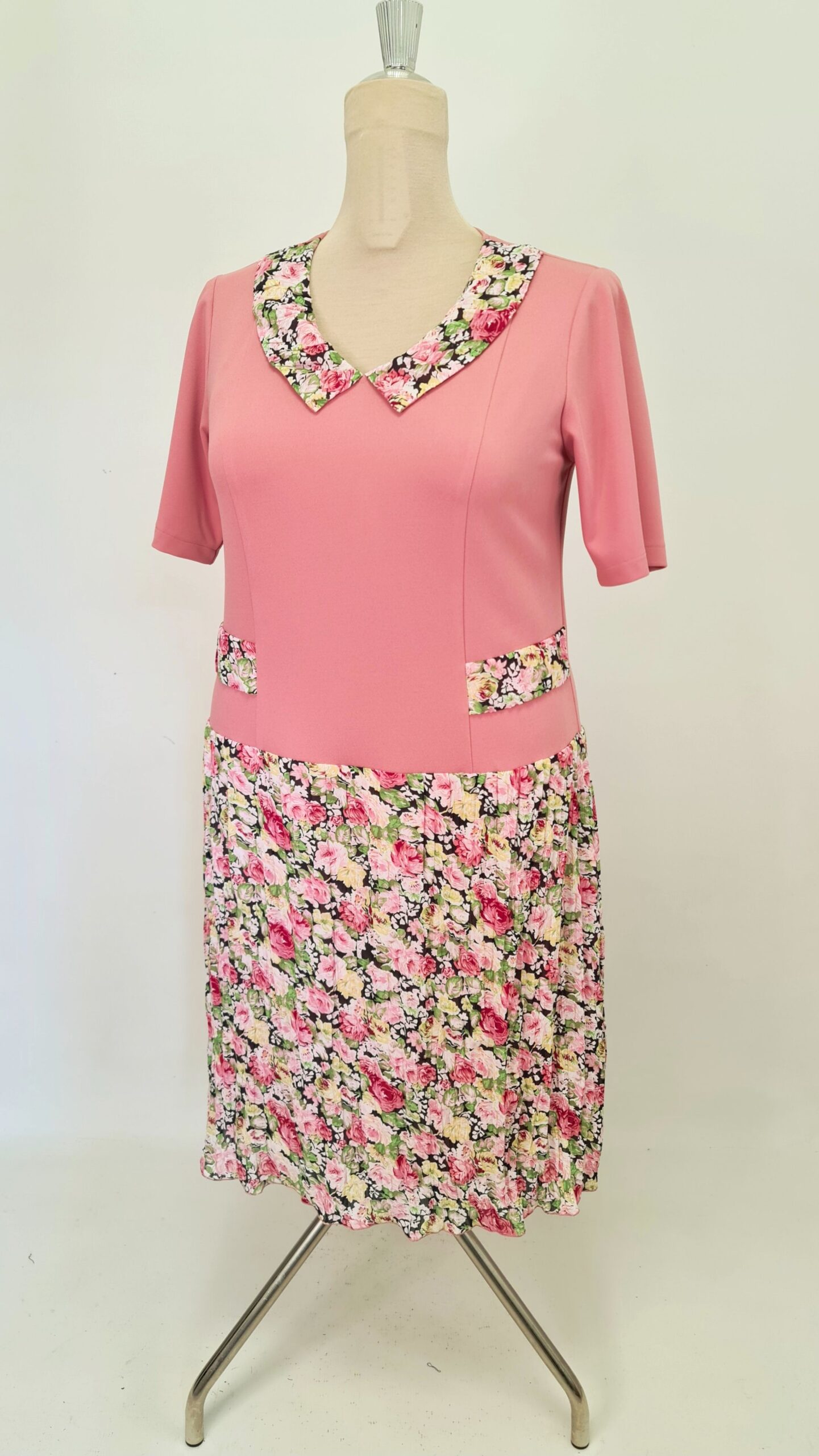Rochie cu bustul tip sacou, guler si clapite dublate, fusta în A din voal gofrat nesifonabil si  căptușeală milaneza, imita un set din doua piese sacou și fusta.