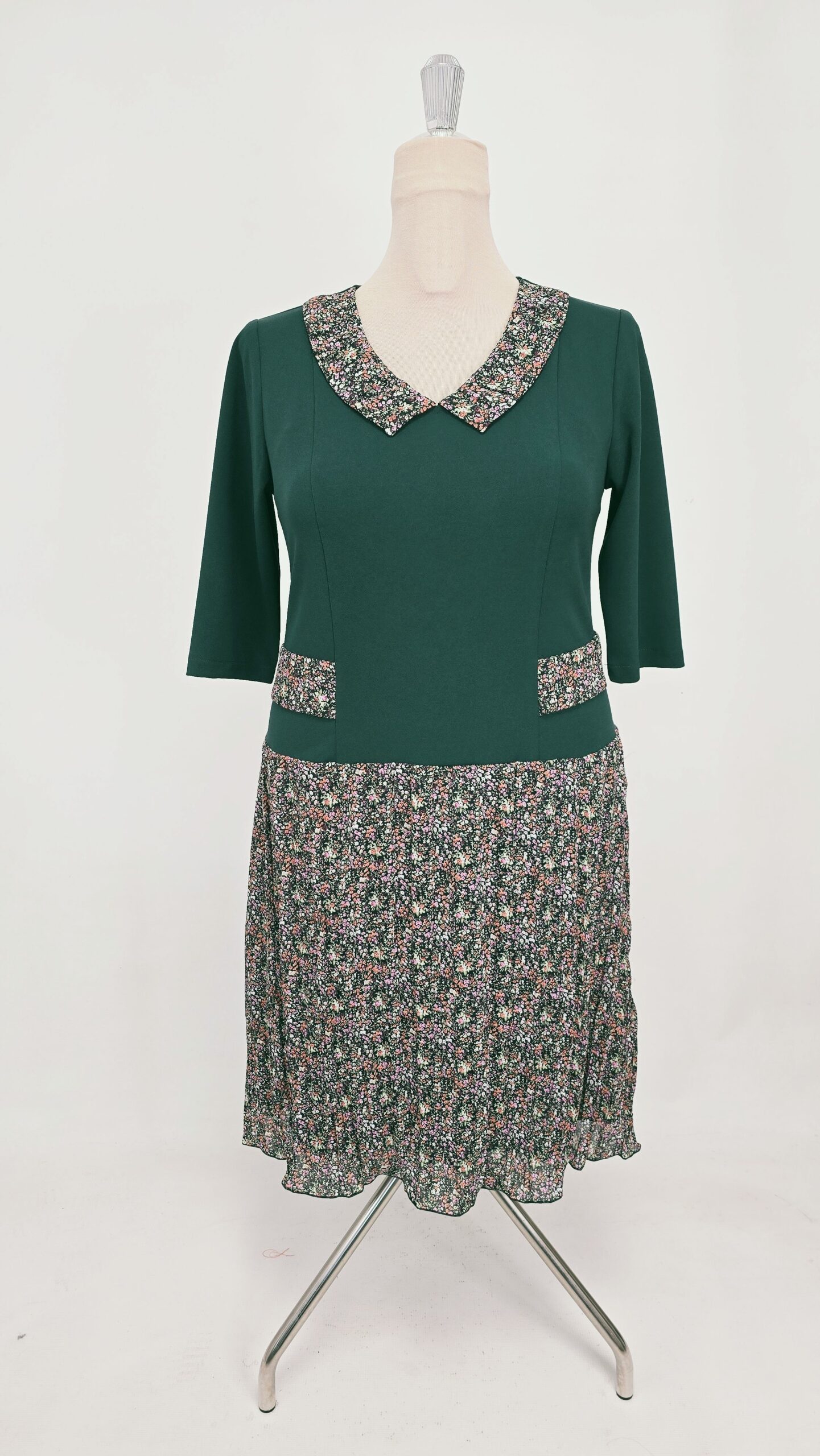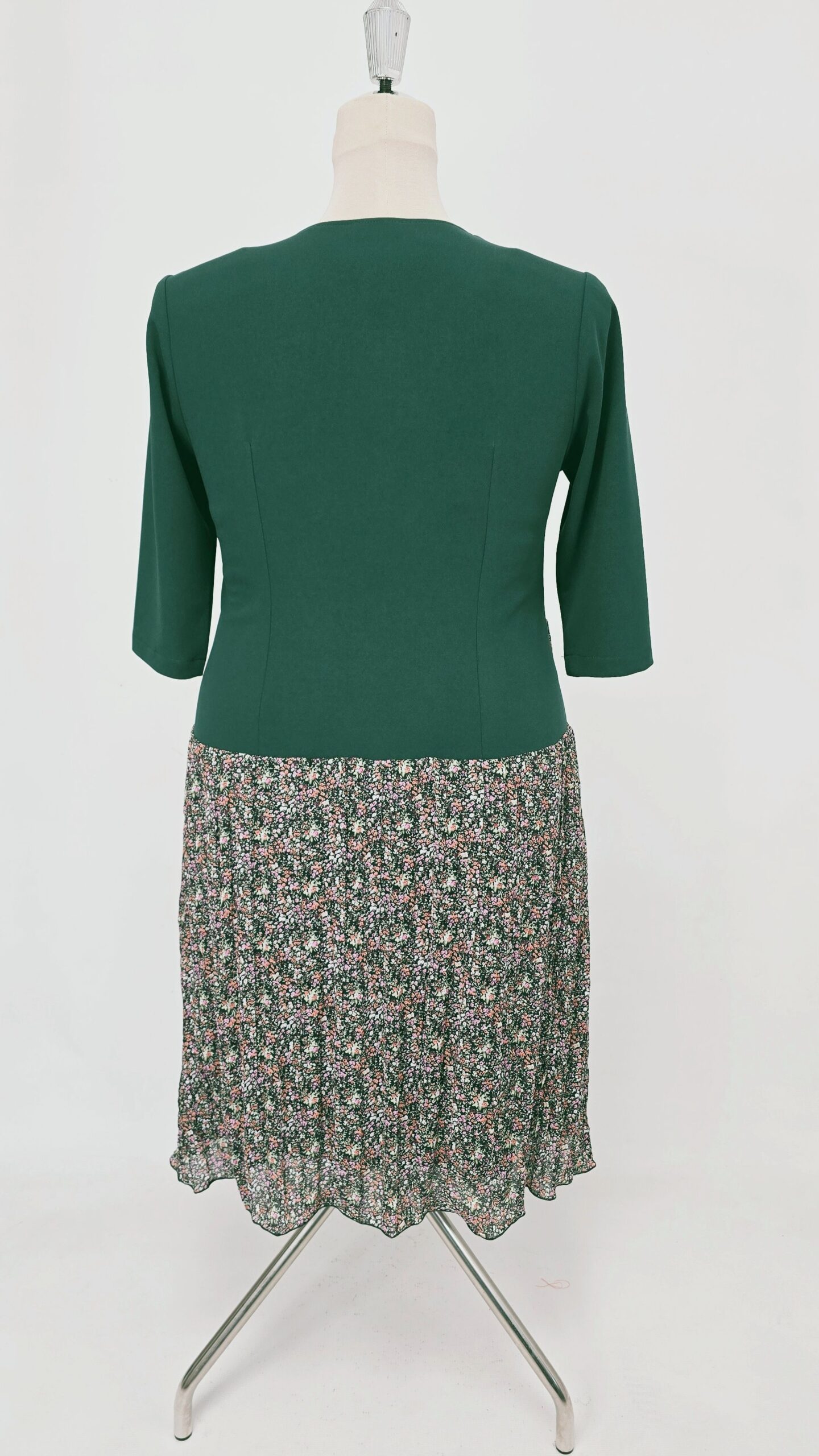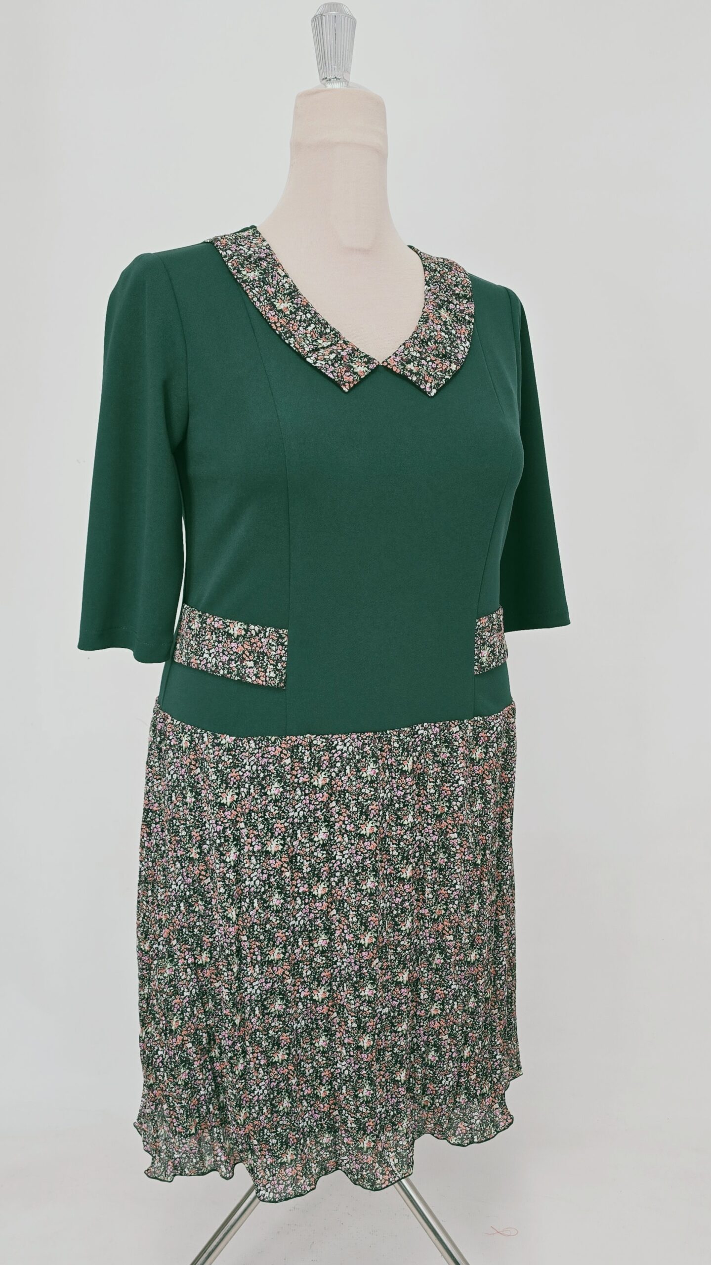 Rochie cu bustul tip sacou, guler si clapite dublate, fusta în A din voal gofrat nesifonabil si căptușeală milaneza, imita un set din doua piese sacou și fusta.